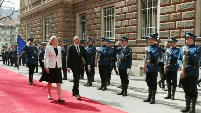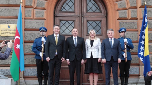 AZƏRTAC xəbər verir ki, Azərbaycanın və Bosniya və Herseqovinanın Dövlət bayraqlarının dalğalandığı meydanda Prezident İlham Əliyevin şərəfinə fəxri qarovul dəstəsi düzülmüşdü.