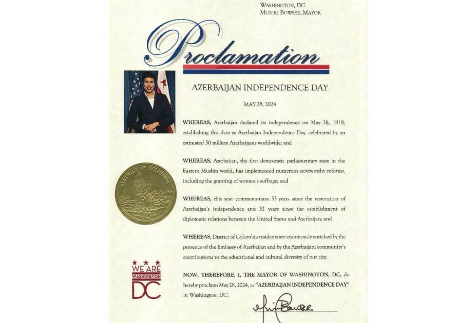 Vaşinqton şəhərinin meri Myuriel Bauzer Azərbaycan Xalq Cümhuriyyətinin yaranmasının 106-cı ildönümü ilə bağlı 28 May tarixini Vaşinqton şəhərində Azərbaycanın Müstəqillik Günü elan edib və bununla bağlı Bəyannamə imzalayıb. AZƏRTAC-ın məlumatına görə, Bəyannamədə 1918-ci ildə müsəlman dünyasında ilk parlamentli demokratik respublika olan və Şərqdə qadınlara ilk dəfə səsvermə hüququ verməklə yanaşı bir sıra vacib islahatlara imza atan dövlətlərdən birinin - Azərbaycan Demokratik Respublikasının yaranması münasibətilə dünyada 50 milyondan çox azərbaycanlının Müstəqillik Gününü qeyd etdiyi bildirilib.