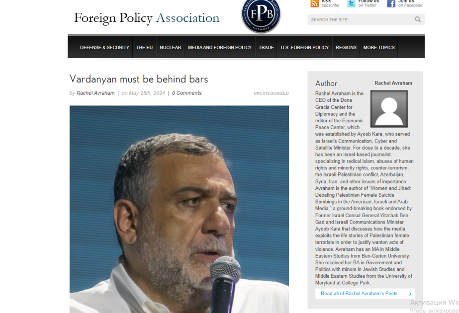 Məqalədə, həmçinin diqqətə çatdırılıb ki, cinayətkar fəaliyyətinə çirkli pulların yuyulması da daxil olan Vardanyanın biznes şirkətləri Qərbin iqtisadi sanksiyalarına məruz qalıb. Bildirilib ki, Vardanyan Azərbaycan ərazisi olan Qarabağdan Ermənistan ərazisinə qaçmağa cəhd edərkən Azərbaycan-Ermənistan sərhədində Azərbaycan hərbçiləri tərəfindən həbs olunub. Azərbaycan tərəfi Vardanyanı Azərbaycanla Ermənistan arasında sülh prosesini sabotaj etməkdə, sərhədi qanunsuz keçməkdə, terrorçuluğu maliyyələşdirməkdə və şəxsən Azərbaycana qarşı yönəlmiş erməni terrorizmi ilə əlaqəli olmaqda ittiham edir. Eyni zamanda, qeyd olunub ki, Vardanyan erməni separatçı quldur dəstələrini Azərbaycan Ordusuna qarşı istifadə üçün pul və sursatla təmin etmək məqsədilə beynəlxalq hüquqi baxımdan Azərbaycan ərazisi hesab olunan Qarabağa qanunsuz keçib. Erməni separatçılarının Vardanyandan aldıqları silahların miqdarı o qədər çoxdur ki, bu günədək həmin silahlar aşkar olunmaqdadır. Müəllif dəfələrlə Azərbaycan hökumətini hədələyən Vardanyanın sözügedən ittihamları heç vaxt təkzib etmədiyini, habelə Azərbaycanın bir çox siyasi və dövlət xadiminin qətli ilə nəticələnən “Nemezis” terror əməliyyatını həyata keçirən erməni terrorçularını açıq-aşkar tərənnüm etdiyini vurğulayıb.