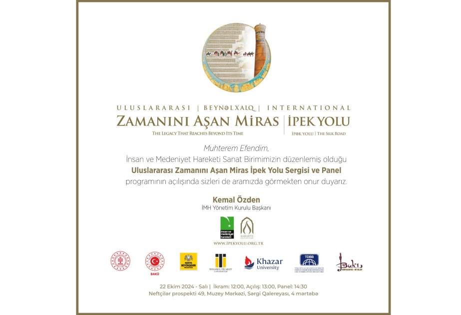 AZƏRTAC xəbər verir ki, sərgi Türkiyənin İnsan və Mədəniyyət Hərəkatı Sənət Birliyinin təşkilatçılığı, qardaş ölkənin Mədəniyyət və Turizm Nazirliyi, Azərbaycandakı səfirliyi, Konya Böyükşəhər Bələdiyyəsi, Türk Dünyası Bələdiyyələr Birliyi, İstanbul Ticarət Universiteti, Xəzər Universiteti, Muzey Mərkəzi və Bakı Rəsm Qalereyasının dəstəyi ilə təşkil olunacaq.