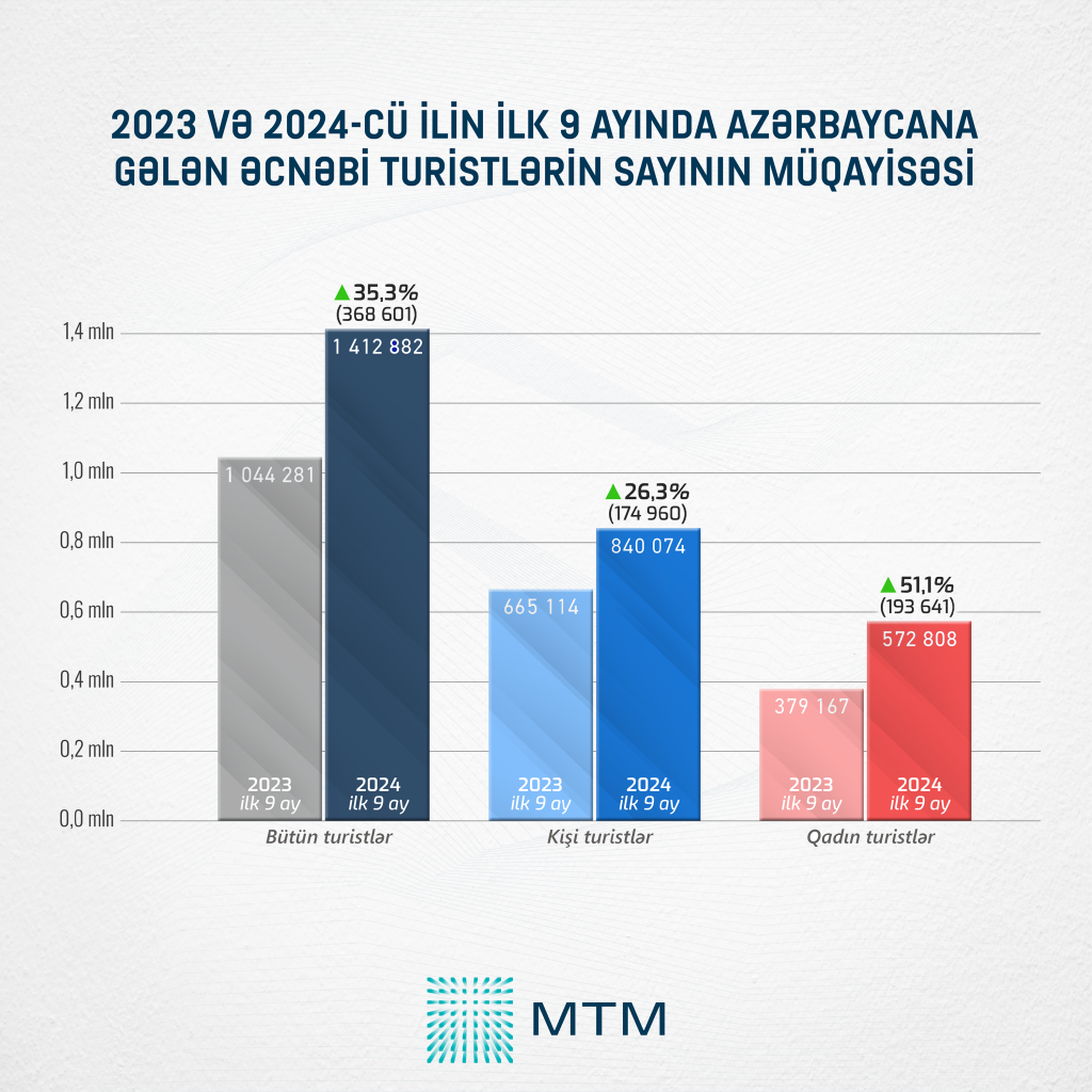 MTM-in Dövlət Statistika Komitəsi tərəfindən təqdim olunan rəsmi məlumatlar əsasında apardığı təhlil göstərir ki, cari ilin yanvar-avqust aylarında Azərbaycana 1 412 882 əcnəbi turist gəlib və bu göstərici ötən ilin eyni dövrü ilə müqayisədə 35,3% və ya 368 601 turist çox olub.