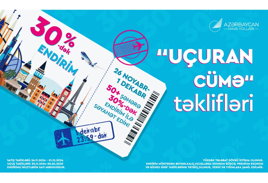 26 noyabr–1 dekabr tarixlərində sərnişinlər AZAL-ın 50-dən çox istiqaməti üzrə aviabiletləri 30%-dək endirimlə əldə edə biləcəklər. Təklif 2024-cü il noyabrın 30-dan 2025-ci il aprelin 30-na kimi həyata keçirilən reyslərə şamil olunur.