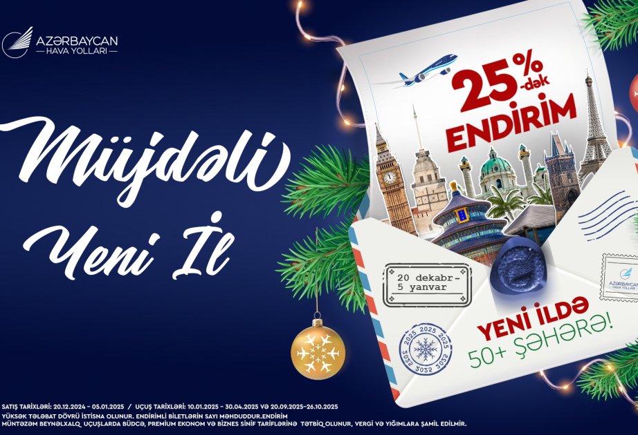 AZAL-dan AZƏRTAC-a bildirilib ki, 20 dekabr - 5 yanvar satış tarixlərində sərnişinlər AZAL-ın 50-dən çox istiqaməti üzrə aviabiletləri 25 faizədək endirimlə əldə edə biləcəklər. Təklif yanvarın 10-dan aprelin 30-na kimi və 20 sentyabr - 26 oktyabr tarixləri arasında həyata keçiriləcək reyslərə şamil olunur.
