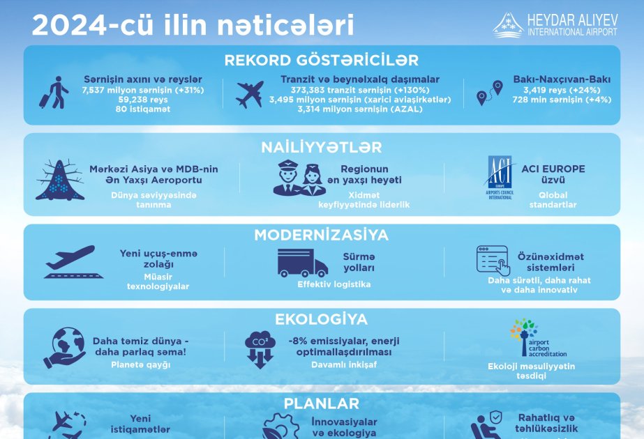 Qeyd edək ki, 2025-ci ildə Heydər Əliyev Beynəlxalq Aeroportu marşrut şəbəkəsinin genişləndirilməsi, yeni texnologiyaların tətbiqi yolu ilə xidmət keyfiyyətinin yüksəldilməsi, təhlükəsizlik standartlarının gücləndirilməsi və aviasiya əməliyyatlarının təhlükəsizliyinin prioritet olaraq saxlanılması, eləcə də karbon izinin daha da azaldılması və ekoloji cəhətdən təmiz həllərin tətbiq olunması istiqamətində inkişafını davam etdirəcək.