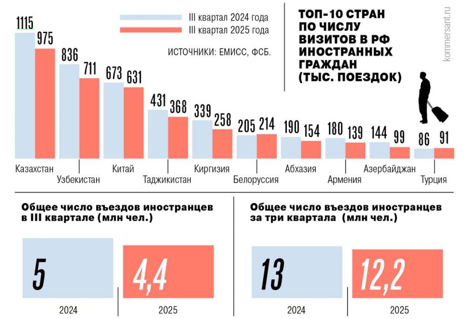 AZƏRTAC FSB Sərhəd Xidmətinin “Kommersant” nəşrində dərc olunan məlumatlarına istinadla xəbər verir ki, iyul-sentyabr ayları ərzində Rusiyaya gələn xarici vətəndaşların ümumi sayı bir il əvvəlki 5 milyon göstərici ilə müqayisədə 4,4 milyona düşüb. Ümumilikdə, 2025-ci ilin ilk doqquz ayında əcnəbilər Rusiyaya 12,2 milyon səfər ediblər ki, bu da ötən illə müqayisədə təxminən 1 milyon azdır. Mütəxəssislər azalmanı daha sərt immiqrasiya siyasəti, “nəzarət altında olan şəxslərin reyestri”nin tətbiqi və vizasız ölkələrin vətəndaşları üçün qalma müddətinə qoyulan məhdudiyyətlərlə əlaqələndirirlər.