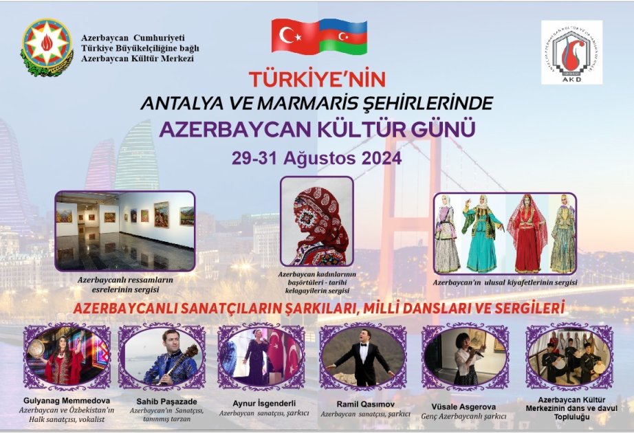 Həmçinin Antalyada Azərbaycan incəsənət ustalarının iştirakı ilə geniş konsert proqramı keçiriləcək. Konsertdə Azərbaycan və Özbəkistanın Xalq artisti Gülyanaq Məmmədova, Azərbaycanın Əməkdar artistləri Ramil Qasımov, tarzən Sahib Paşazadə, gənc azərbaycanlı müğənnilər Aynur İsgəndərli, Vüsalə Əskərova milli musiqi əsərlərimizi Mədəniyyət Mərkəzimizin Azərbaycan Xalq Rəqsləri Ansamblı isə milli rəqslərimizi ifa edəcəklər.