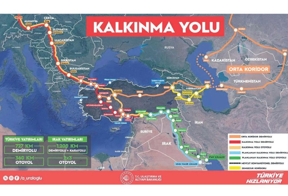 Nəqliyyat naziri qeyd edib ki, “İnkişaf yolu” layihəsi çərçivəsində İraqın Fao limanından Türkiyə ilə sərhəddə yerləşən Ovaköy rayonuna ümumi uzunluğu 1200 kilometr olan dəmir və avtomobil yolları çəkiləcək. Türkiyə ərazisində 727 kilometr dəmir yolu və 360 kilometr avtomobil yolu çəkiləcək ki, bu da ümumilikdə Asiya ilə Avropa arasında mal mübadiləsini xeyli asanlaşdıracaq.