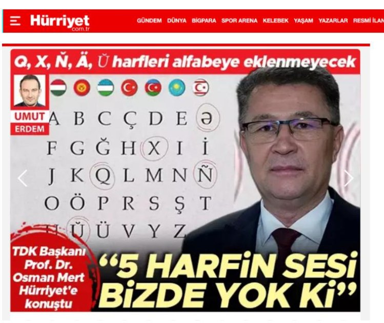 Mert “Hürriyet” qəzetinə müsahibəsində qeyd edib ki, 1928-ci ildə ölkədə qəbul edilən türk əlifbasının 29 hərfi türk dilində sözlərin səs görünüşünü çatdırmaq üçün kifayət edir, beş hərf isə (Q, X, Ň, Ümumi türkcəyə əlavə olaraq daxil olan Ə, Ŭ) digər türk dillərinin zənginliyini əks etdirir.