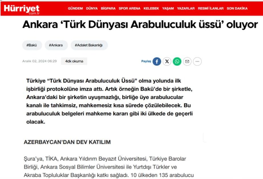 Məqalədə qeyd olunur ki, 10 ölkədən 135 mediator mediasiya sahəsində əməkdaşlıq yollarını müzakirə etmək üçün Ankarada bir araya gəlib. Xüsusən, Azərbaycanı 86 mediator, eləcə də İnsan Hüquqları üzrə Müvəkkil (Ombudsman) Səbinə Əliyeva təmsil edib.