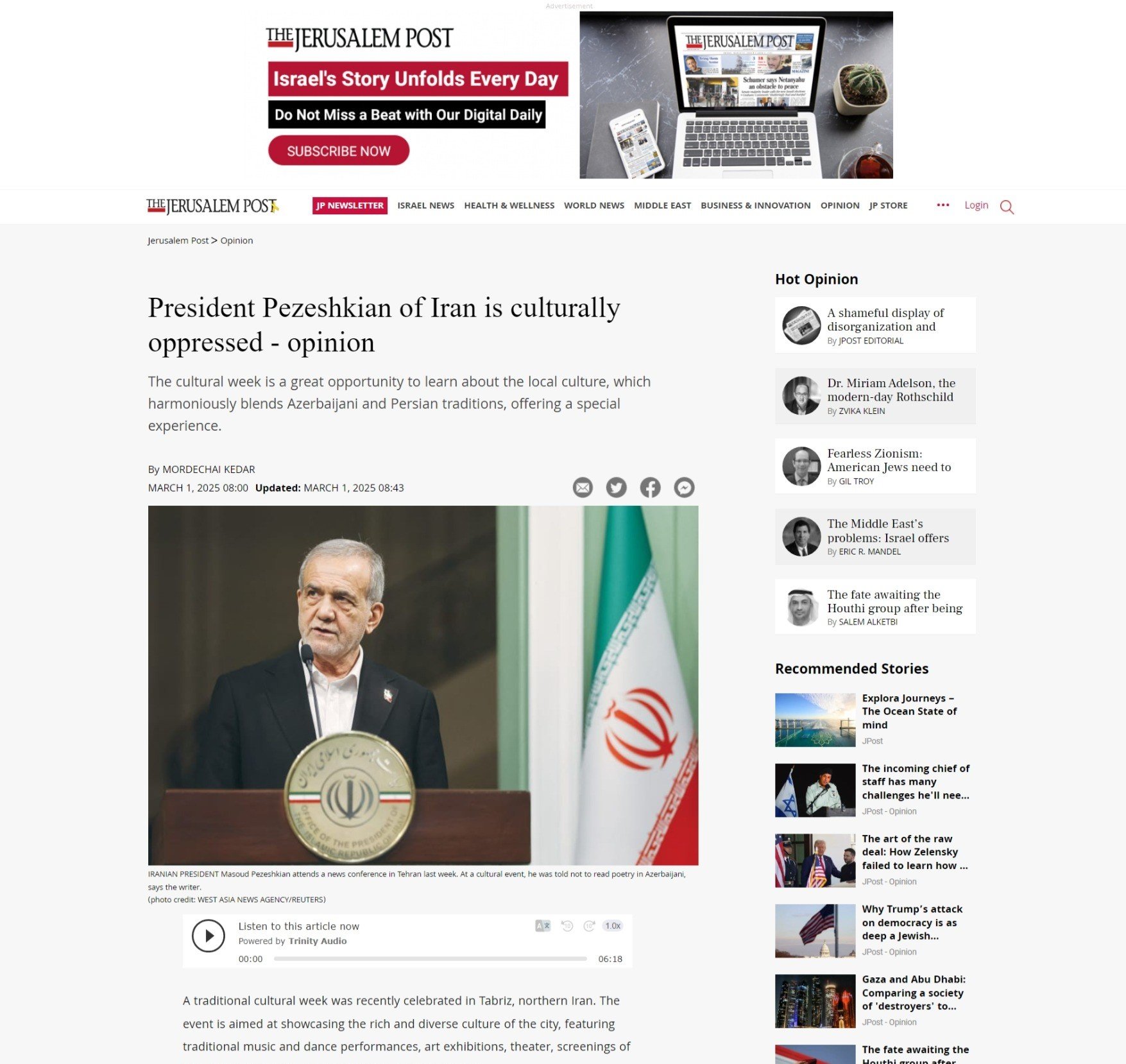 Yazıda Prezident Pezeşkianın mədəniyyət həftəsinin bağlanış mərasimində çıxışı zamanı dramatik məqamın yaşandığı diqqətə çatdırılıb. Belə ki Pezeşkian məşhur təbrizli şair, “Şəhriyar” ləqəbi ilə tanınan Məhəmmədhüseyn Behcət Təbrizinin xatirəsini onun Azərbaycan dilində qələmə aldığı “Heydərbabaya salam” poemasından bir neçə misra iqtibas etməklə anıb. Həmin an mərasimi təşkil edən rəsmilərdən biri dövlət başçısının çıxışını kəsərək ona şeiri Azərbaycan dilində deməmək barədə xəbərdarlıq edib. Pezeşkianın gülümsəyərək “Türkcə iki misra şeir oxumaqda problem yoxdur” cavabı tamaşaçıların alqışına səbəb olub. İsrailli professor yazısında İran prezidentinin söylədiyi misranı olduğu kimi - Azərbaycan dilində tərcüməsi ilə əks etdirib.