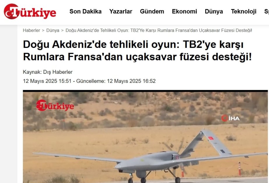 “Bayraktar TB2” PUA-ları Liviya, Suriya və Azərbaycanın Qarabağ bölgəsi də daxil olmaqla yüksək effektivliyi və manevr qabiliyyətini sübut edib. Mütəxəssislər Fransanın “Mistral 3”lərinin Türkiyə pilotsuz təyyarələrinə qarşı effektivliyinə şübhə ilə yanaşırlar”, - deyə nəşr yazır.