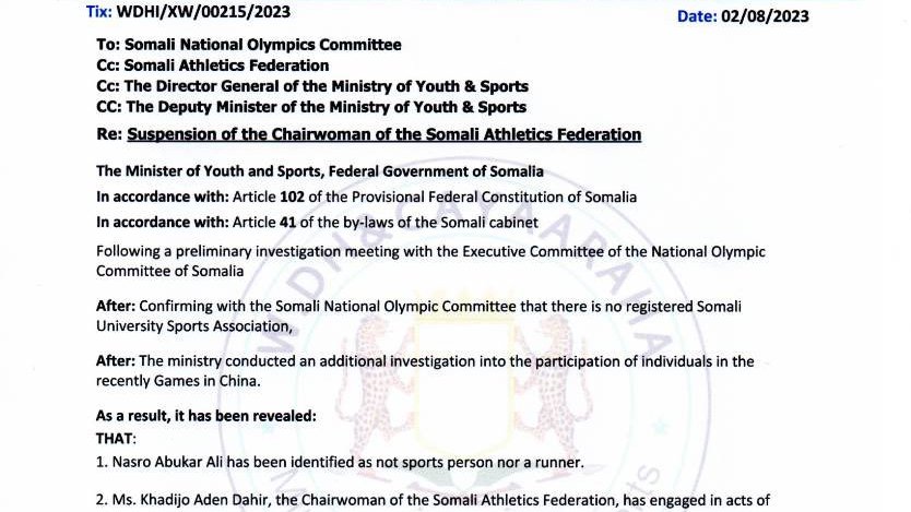 The Somali Ministry of Youth and Sports said in a statement, "The ministry conducted an investigation into the participants of the recent games in China. The results revealed that Nasro Abukar Ali was not an athlete or runner. The President of the Somali Athletics Federation, Khadijo Aden Dahir, has committed acts of abuse of authority, nepotism and defaming the name of the nation in the international arena."