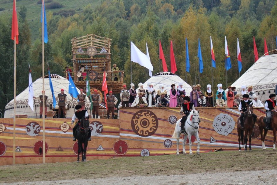 The program included national games reflecting the daily life, martial arts, hunting traditions, and intellectual culture of nomadic peoples, such as: jerit (spear throwing on horseback), tayaq tartysh (stick tug-of-war), goresh (traditional wrestling of the Turkic peoples), gulesh (Turkish oil wrestling), aba kureshu (horseback wrestling), archery (on foot, on horseback, and long-range), burkut saluu (golden eagle hunting), dalba oynotuu (the art of controlling a falcon using a lure on a cord), taigan zharish (dog racing of the Taigan breed), and mangala (a board game of logic).