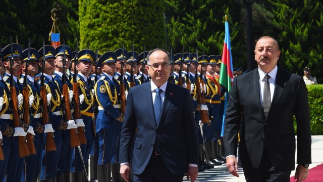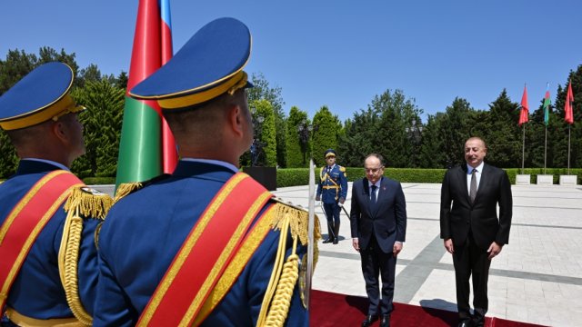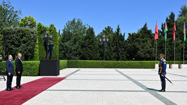 The guard of honor marched in front of President of Azerbaijan Ilham Aliyev and President of Albania Bajram Begaj to the accompaniment of a military march.