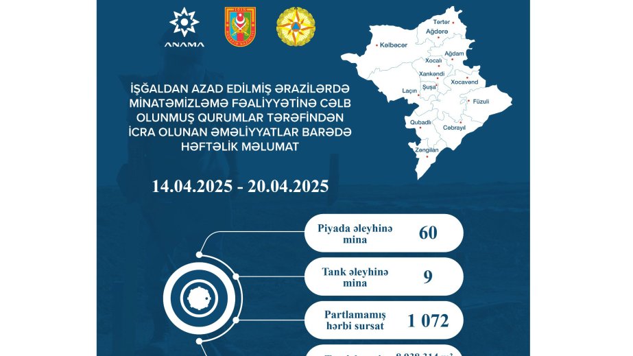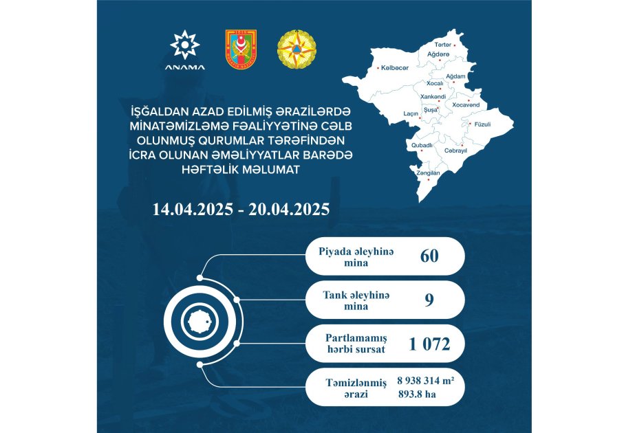 Azerbaijan’s Mine Action Agency (ANAMA) has reported that from April 14 to 20, a total of 893.8 hectares were cleared of mines and unexploded ordnances (UXOs) across multiple districts.