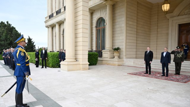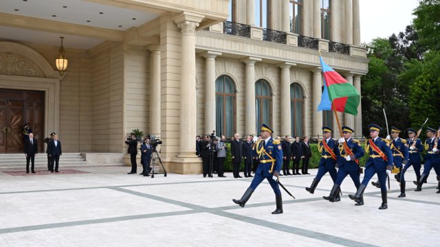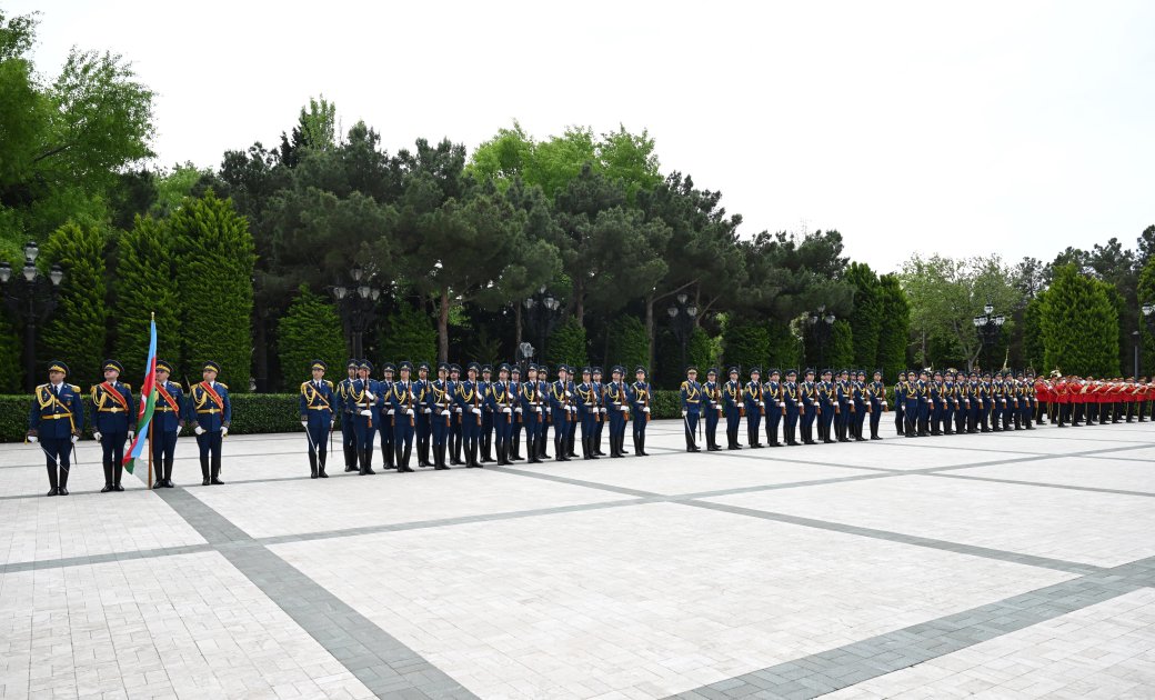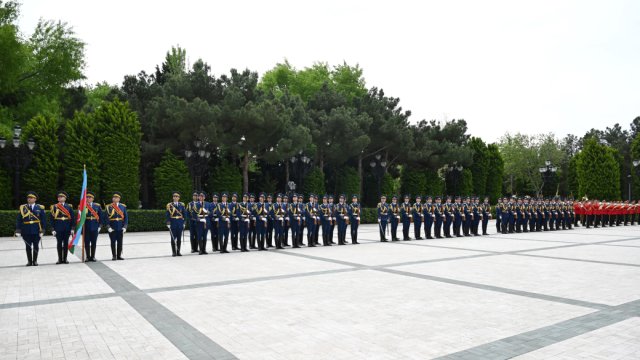 The guard of honor marched in front of President Ilham Aliyev and President Masoud Pezeshkian to the accompaniment of a military march.