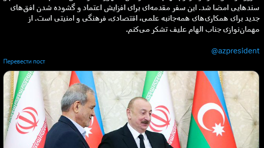 This visit marked the beginning of new opportunities for comprehensive cooperation in science, the economy, culture, and security, and for building greater trust between our countries. I thank President Aliyev for his warm hospitality," President Pezeshkian wrote on his page on X.