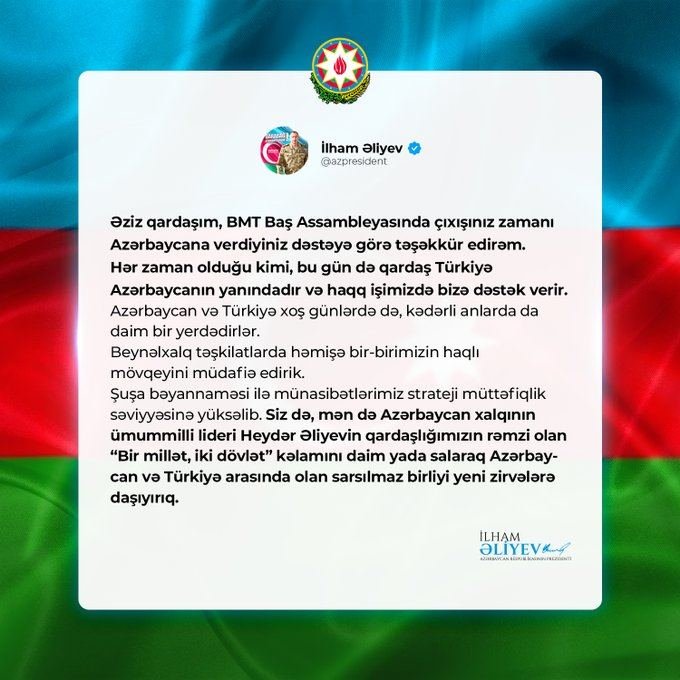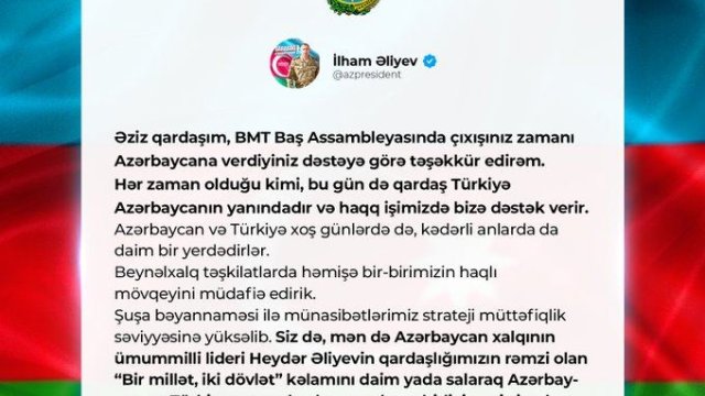BAKU, Azerbaijan, September 20. President of the Republic of Azerbaijan Ilham Aliyev thanked Turkish President Recep Tayyip Erdogan for expressing support for Azerbaijan during his speech at the UN General Assembly, Trend reports.