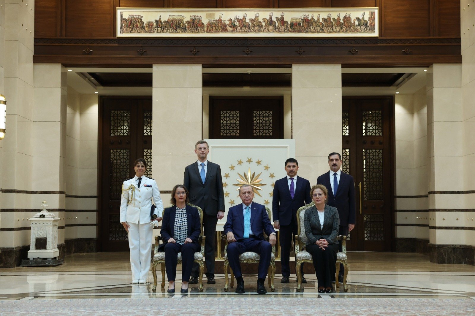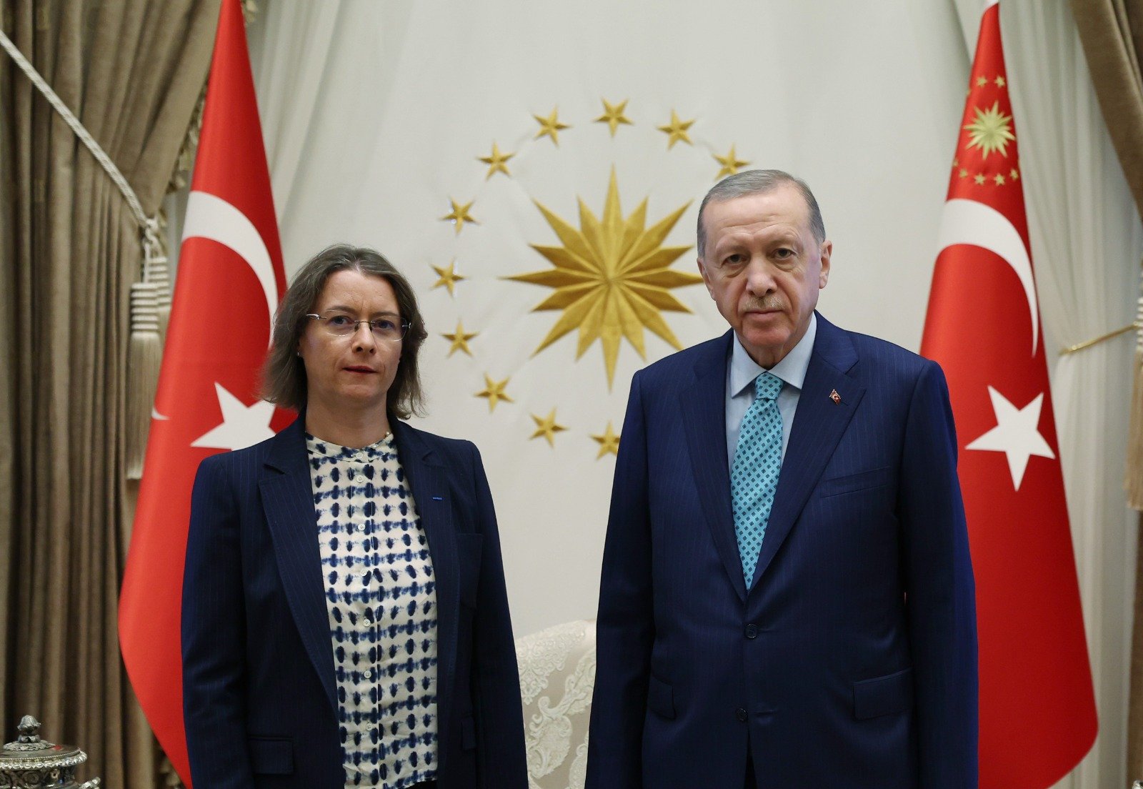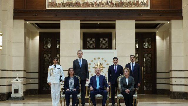 President Recep Tayyip Erdoğan received the newly appointed French Ambassador Isabelle Dumont at the Presidential Complex. Dumont, who has served as French President Emmanuel Macron's advisor in charge of relations with Europe and Turkey for the last 3 years, presented her letter of credence to Erdoğan. Afterwards, the ambassador and her entourage took a souvenir photo with President Erdoğan.