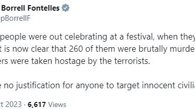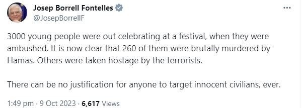 Borrell made a statement about the civilians killed at the festival: "3,000 young people were ambushed while celebrating at a festival. It is now certain that 260 of them were brutally murdered by Hamas. The others were taken hostage by terrorists. There can be no justification for anyone to target innocent civilians."