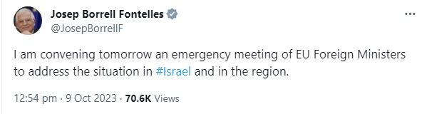 osep Borrell, High Representative of the European Union for Foreign Affairs and Security Policy, said on his social media account, "I am calling for an urgent meeting of EU Foreign Ministers tomorrow to discuss the situation in Israel and the region."