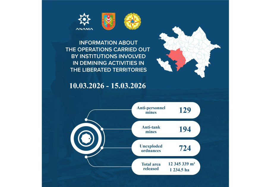 From March 10 to 15, the Azerbaijan Mine Action Agency (ANAMA) conducted mine-clearance operations in the districts of Tartar, Aghdara, Kalbajar, Aghdam, Khojaly, Khankendi, Khojavend, Lachin, Shusha, Fuzuli, Gubadli, Jabrayil, and Zangilan.