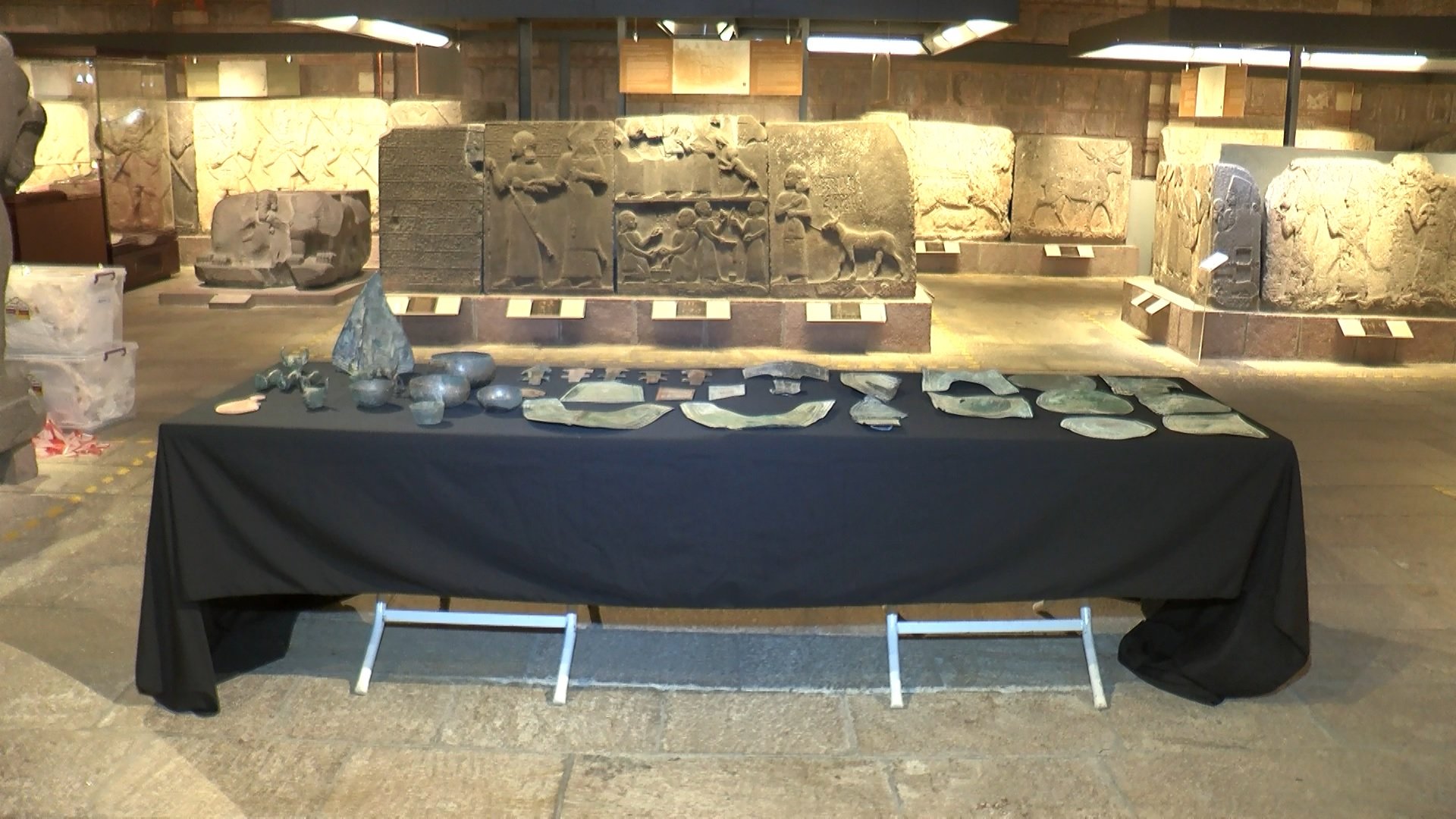 37 eserin ağırlıklı olarak Urartu dönemine ait bronz parçalardan oluştuğunu ifade eden Özdemir, "Urartular, metal işçiliğinde çok gelişmiş bir medeniyet. Buradaki örneklerini de görmekteyiz. At koşum takımları, Urartu kazanlarına aplike edilen boğa başları, günlük kullanım kapları ve mobilya aksamları karşımıza çıkıyor. Aynı eser grubumuzun içinde M.Ö. 3 bin yılına tarihlenen bir idol de görülüyor. Bu, 'Beyce Sultan' ve 'Kusura' tipi idollerin bir birleşimi olarak tanımlanıyor. Batı Anadolu ve İç Batı Anadolu'ya özgü bir tip. Bunun yanı sıra Anadolu’nun Roma dönemine ait gümüş bir vazo parçası ve geyik figürü de bu eser gurubunda yer almakta. Hepsi de bizim için çok önemli, değerli eserler" diye konuştu.