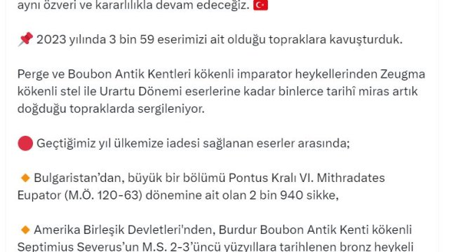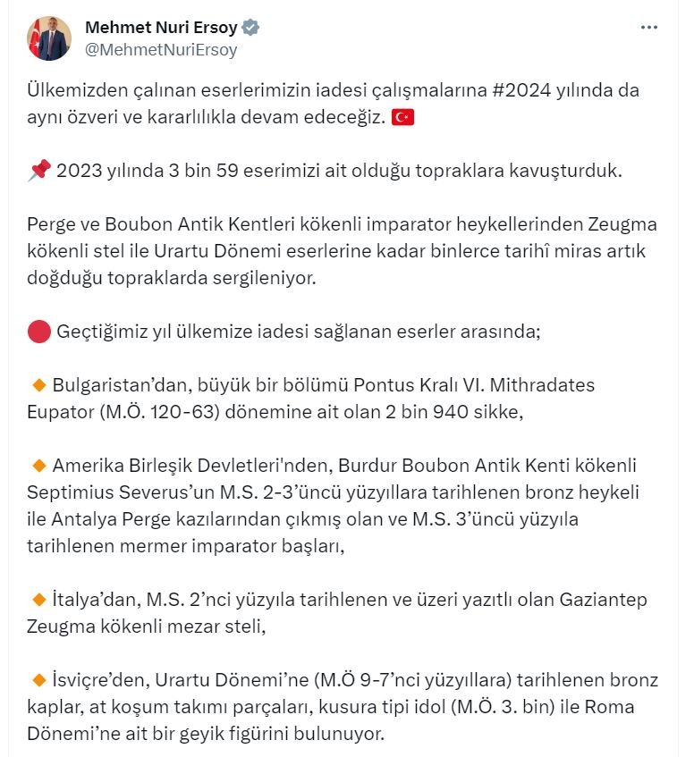 Bakan Ersoy, sosyal medya hesabından yaptığı açıklamada, "Ülkemizden çalınan eserlerimizin iadesi çalışmalarına 2024 yılında da aynı özveri ve kararlılıkla devam edeceğiz. 2023 yılında 3 bin 59 eserimizi ait olduğu topraklara kavuşturduk. Perge ve Boubon Antik Kentleri kökenli imparator heykellerinden Zeugma kökenli stel ile Urartu Dönemi eserlerine kadar binlerce tarihi miras artık doğduğu topraklarda sergileniyor" dedi.