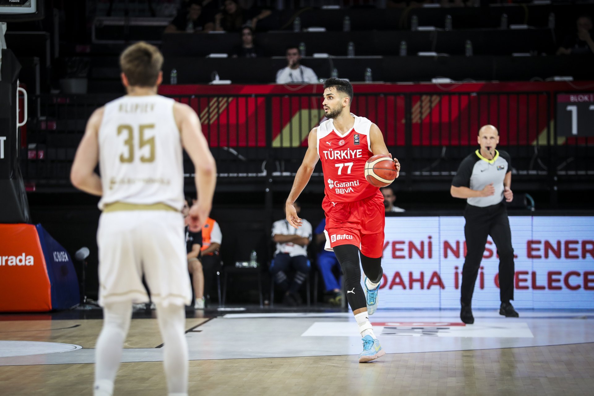 Sinan Erdem Spor Salonu'nda oynanan karşılaşmaya Kenan Sipahi'nin etkili oyunuyla iyi başlayan milli takım, mücadelenin ilk 5 dakikasını 14-8 önde geçti. Periyodun kalan bölümünde Furkan Korkmaz ve Ömer Faruk Yurtseven ile sayılar bulan Türkiye, farkı daha da açarak ilk periyodu 28-13 önde tamamladı.