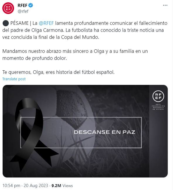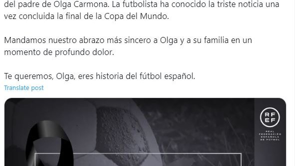 İspanya Kraliyet Futbol Federasyonu’ndan (RFEF) maçtan sonra yapılan açıklamada, “RFEF, Olga Carmona'nın babasının ölümünü bildirdiği için derin üzüntü duymaktadır. Futbolcu acı haberi Dünya Kupası finalinin ardından öğrendi. Olga ve ailesine en içten taziyelerimizi gönderiyoruz. Seni seviyoruz Olga, sen İspanyol futbolunun tarihisin” denildi.
