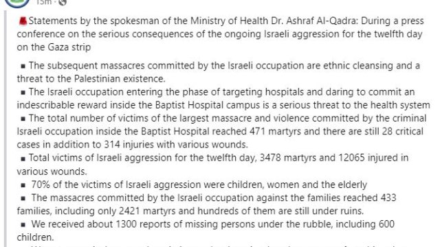 Filistin Sağlık Bakanlığı: 3 bin 478 sivil öldü, 12 bin 65 sivil yaralandı