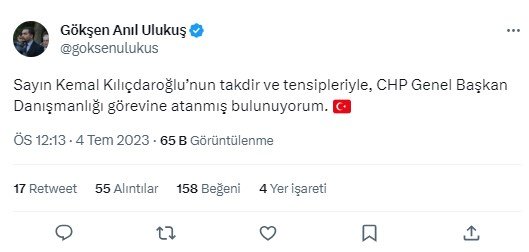 Gökşen Anıl Ulukuş, Twitter hesabından yaptığı açıklamada, "Sayın Kemal Kılıçdaroğlu'nun takdir ve tensipleriyle, CHP Genel Başkan Danışmanlığı görevine atanmış bulunuyorum" ifadelerini kullandı.