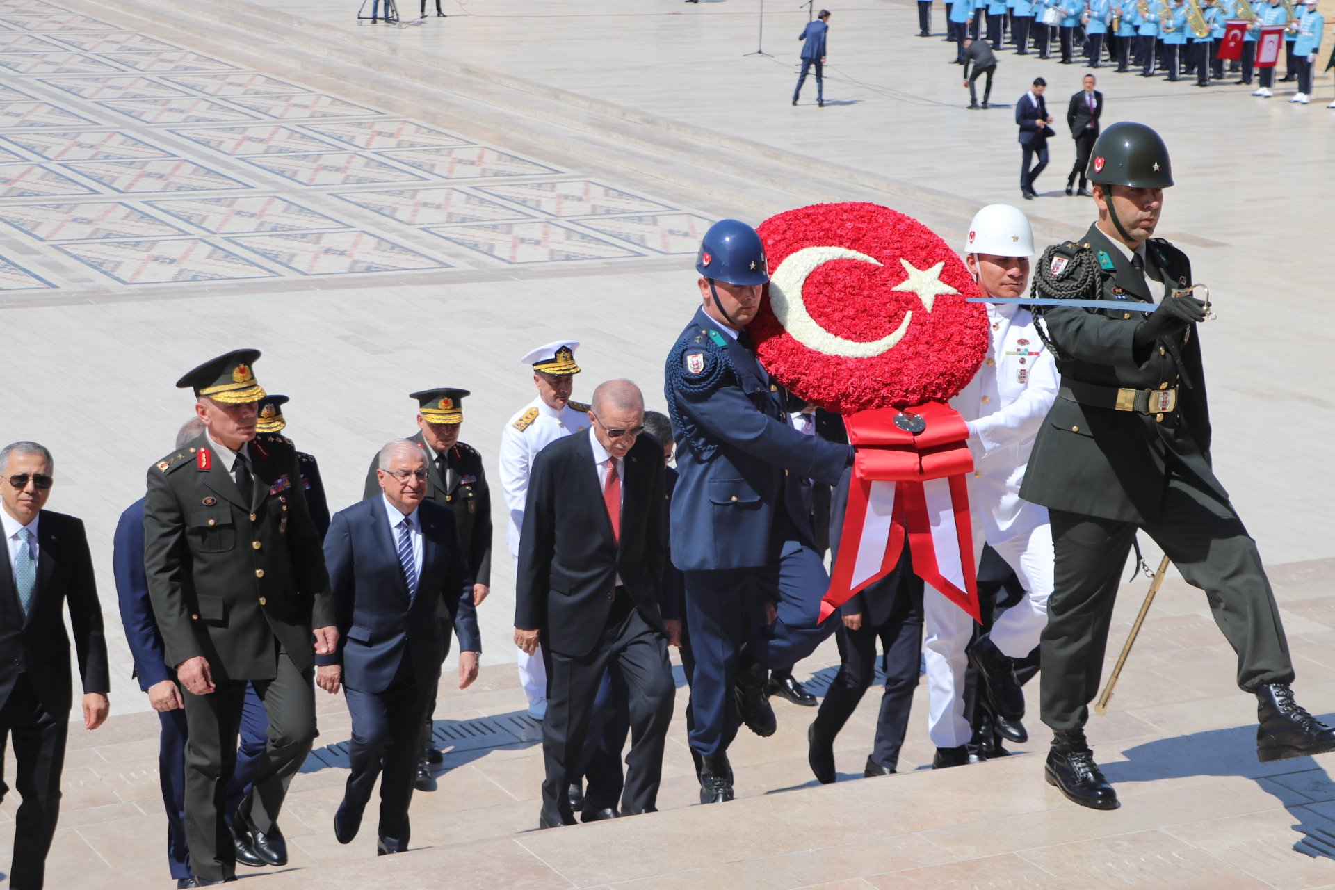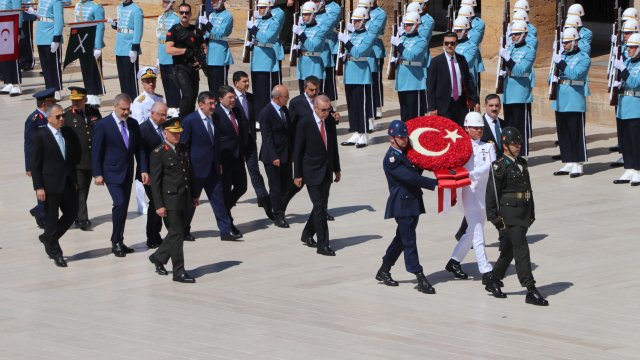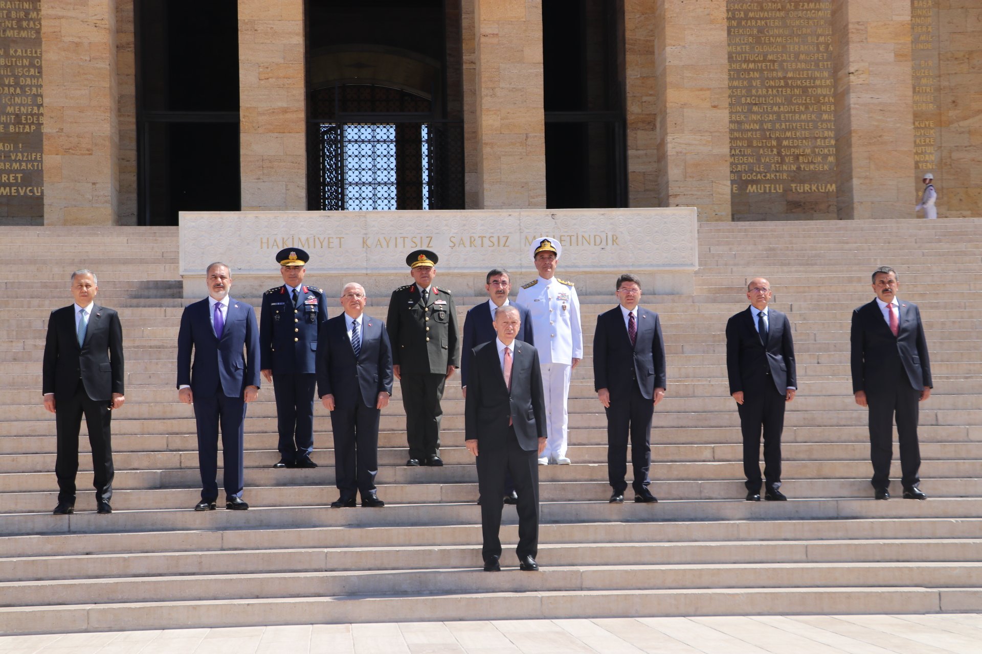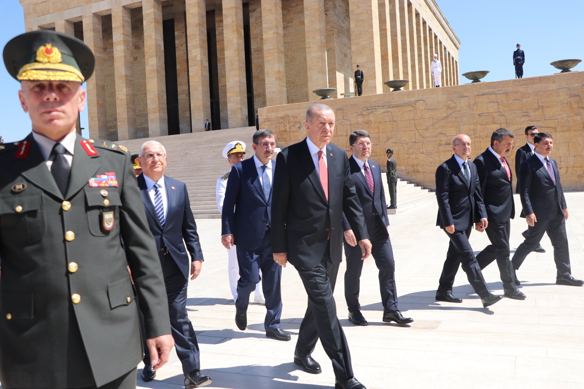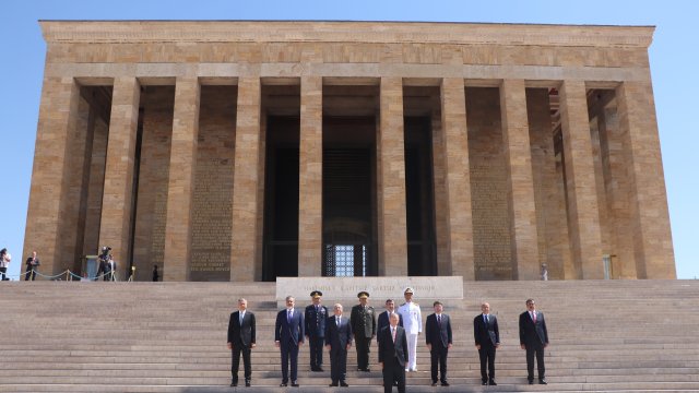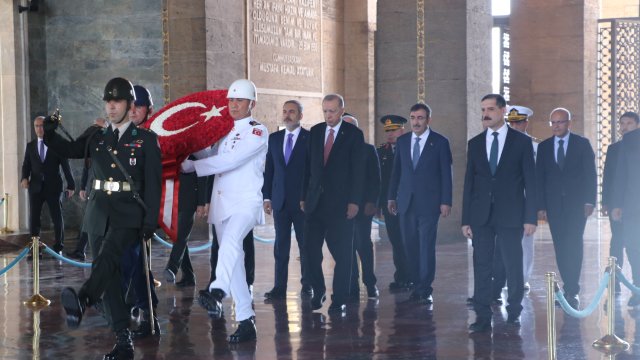 Cumhurbaşkanı Erdoğan, Türk Silahlı Kuvvetleri'nde bir üst rütbeye terfi edecek veya emekliye sevk edilecek general ve amirallerin belirleneceği YAŞ toplantısı öncesi Anıtkabir'i ziyaret etti. Erdoğan, Aslanlı Yol'da beraberinde Cumhurbaşkanı Yardımcısı Cevdet Yılmaz, Milli Savunma Bakanı Yaşar Güler, İçişleri Bakanı Ali Yerlikaya, Adalet Bakanı Yılmaz Tunç, Hazine ve Maliye Bakanı Mehmet Şimşek, Milli Eğitim Bakanı Yusuf Tekin ile Genelkurmay Başkanvekili ve Kara Kuvvetleri Komutanı Orgeneral Musa Avsever, Hava Kuvvetleri Komutanı Orgeneral Atilla Gülan ve Deniz Kuvvetleri Komutanı Oramiral Ercüment Tatlıoğlu ile yürüdü. Mustafa Kemal Atatürk'ün mozolesine çelenk bırakan Erdoğan, saygı duruşunda bulunulması ve İstiklal Marşı'nın okunmasının ardından beraberindeki heyetle Misak-ı Milli Kulesi'ne geçerek, Anıtkabir Özel Defteri'ni imzaladı. Cumhurbaşkanı Erdoğan, şunları yazdı: