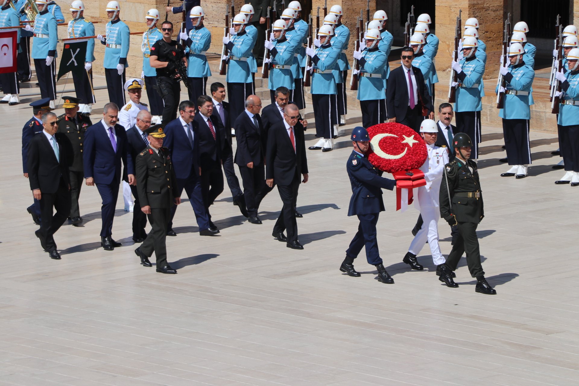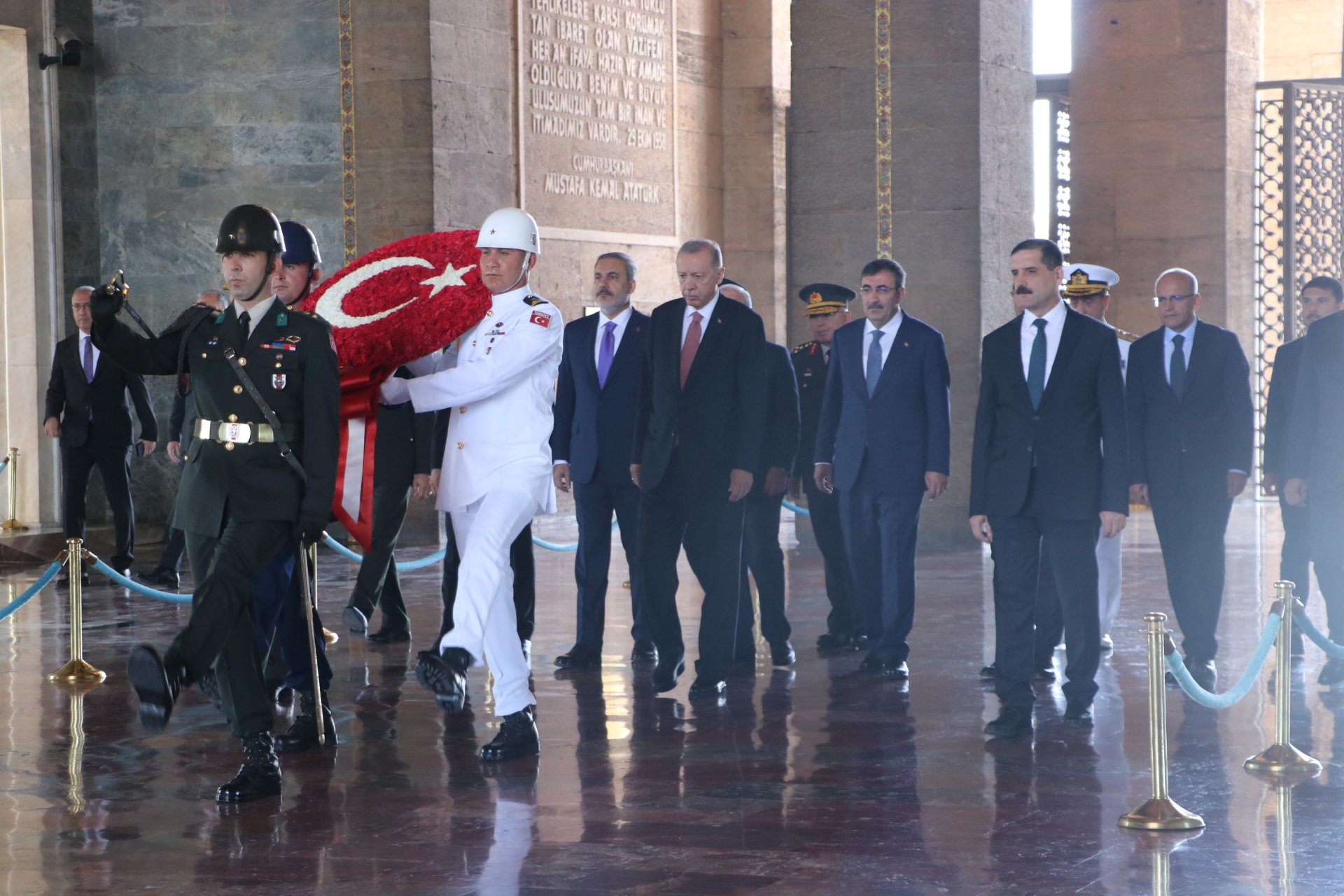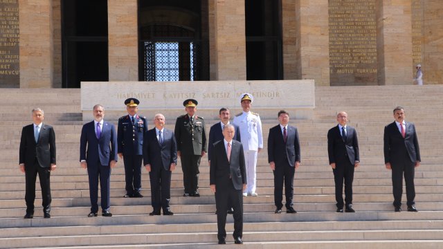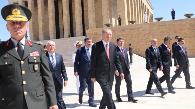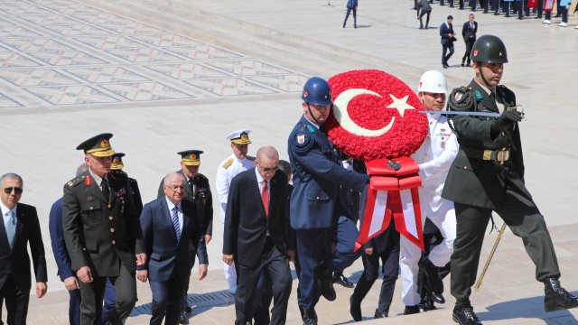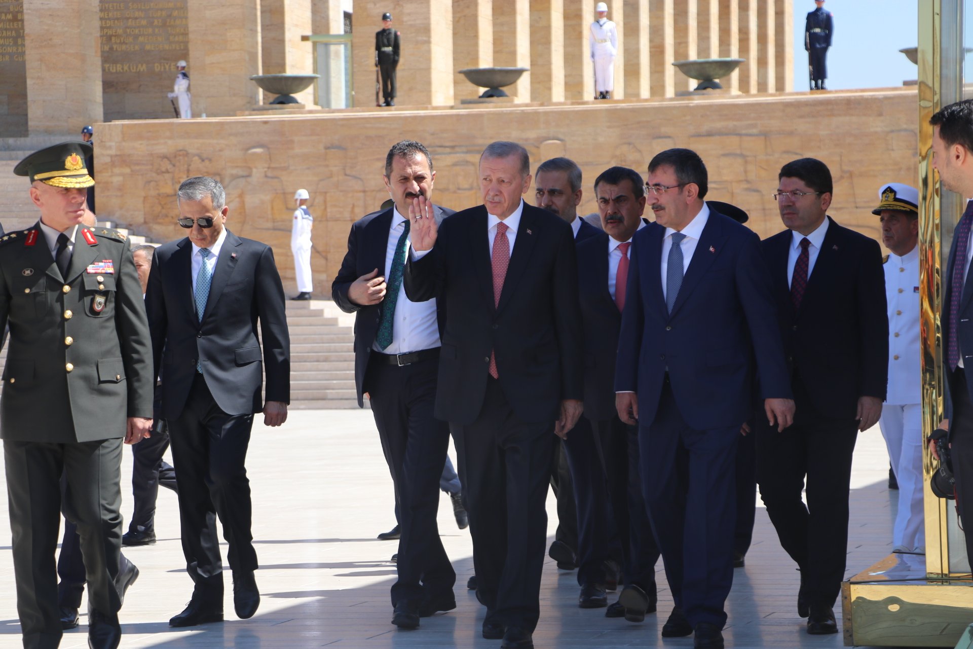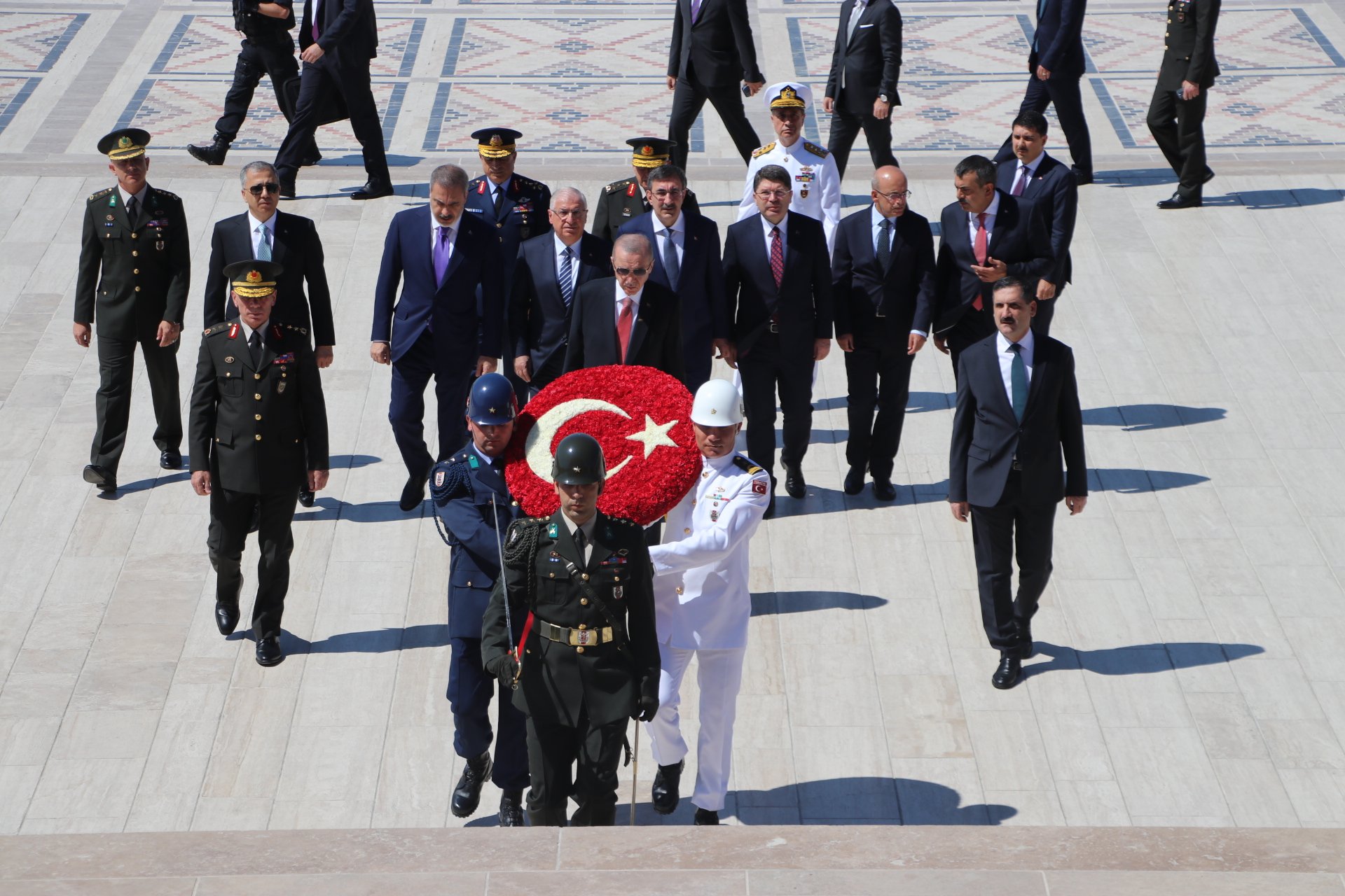 Cumhurbaşkanı Erdoğan, Türk Silahlı Kuvvetleri'nde bir üst rütbeye terfi edecek veya emekliye sevk edilecek general ve amirallerin belirleneceği YAŞ toplantısı öncesi Anıtkabir'i ziyaret etti. Erdoğan, Aslanlı Yol'da beraberinde Cumhurbaşkanı Yardımcısı Cevdet Yılmaz, Milli Savunma Bakanı Yaşar Güler, İçişleri Bakanı Ali Yerlikaya, Adalet Bakanı Yılmaz Tunç, Hazine ve Maliye Bakanı Mehmet Şimşek, Milli Eğitim Bakanı Yusuf Tekin ile Genelkurmay Başkanvekili ve Kara Kuvvetleri Komutanı Orgeneral Musa Avsever, Hava Kuvvetleri Komutanı Orgeneral Atilla Gülan ve Deniz Kuvvetleri Komutanı Oramiral Ercüment Tatlıoğlu ile yürüdü. Mustafa Kemal Atatürk'ün mozolesine çelenk bırakan Erdoğan, saygı duruşunda bulunulması ve İstiklal Marşı'nın okunmasının ardından beraberindeki heyetle Misak-ı Milli Kulesi'ne geçerek, Anıtkabir Özel Defteri'ni imzaladı. Cumhurbaşkanı Erdoğan, şunları yazdı: