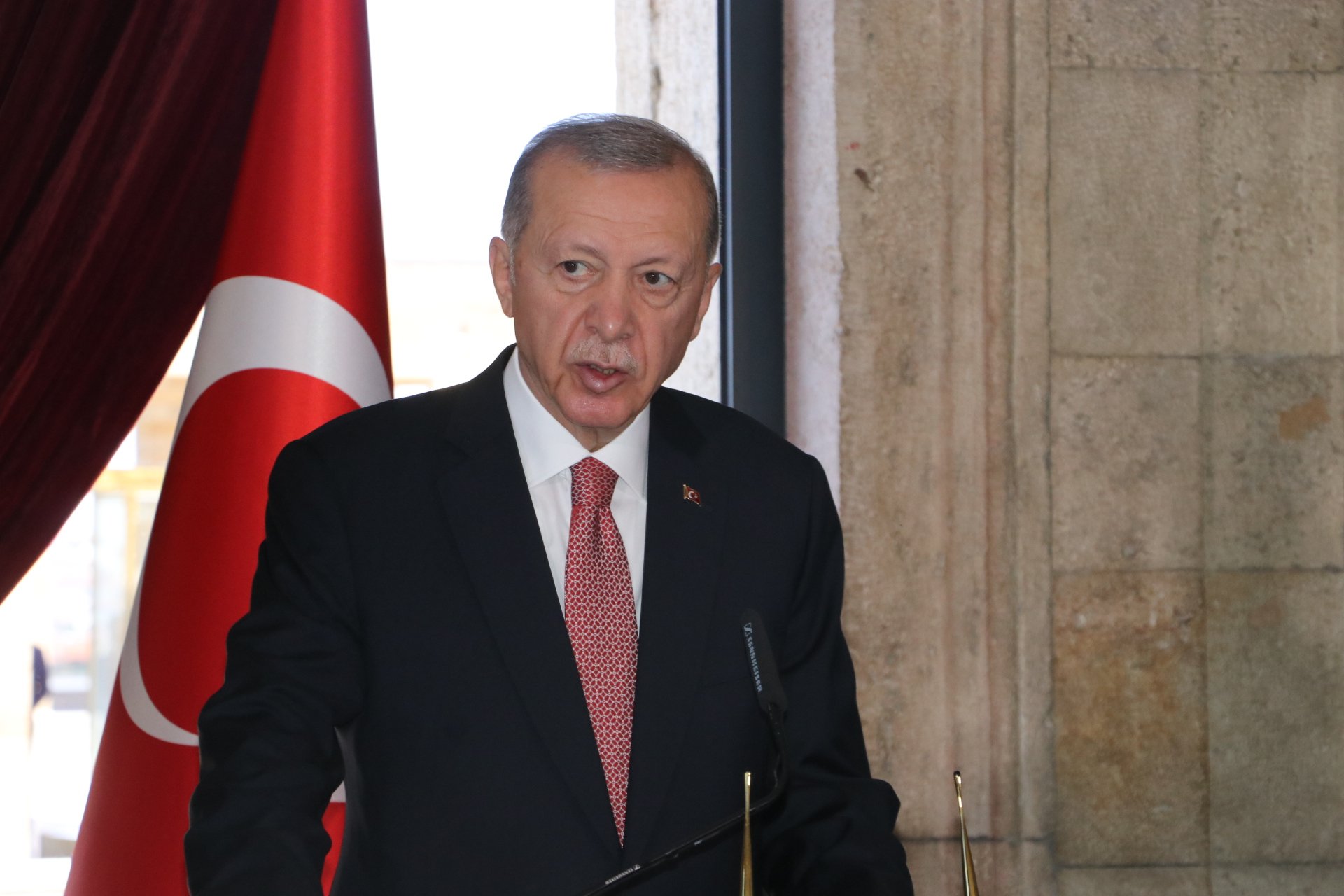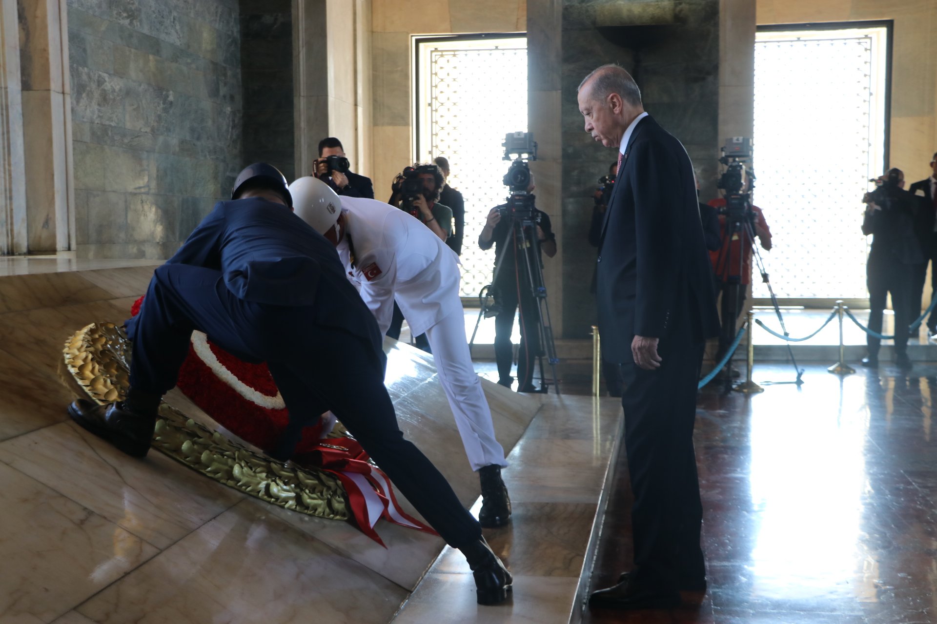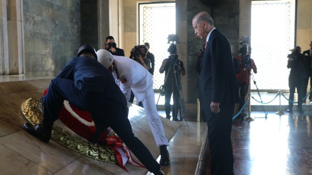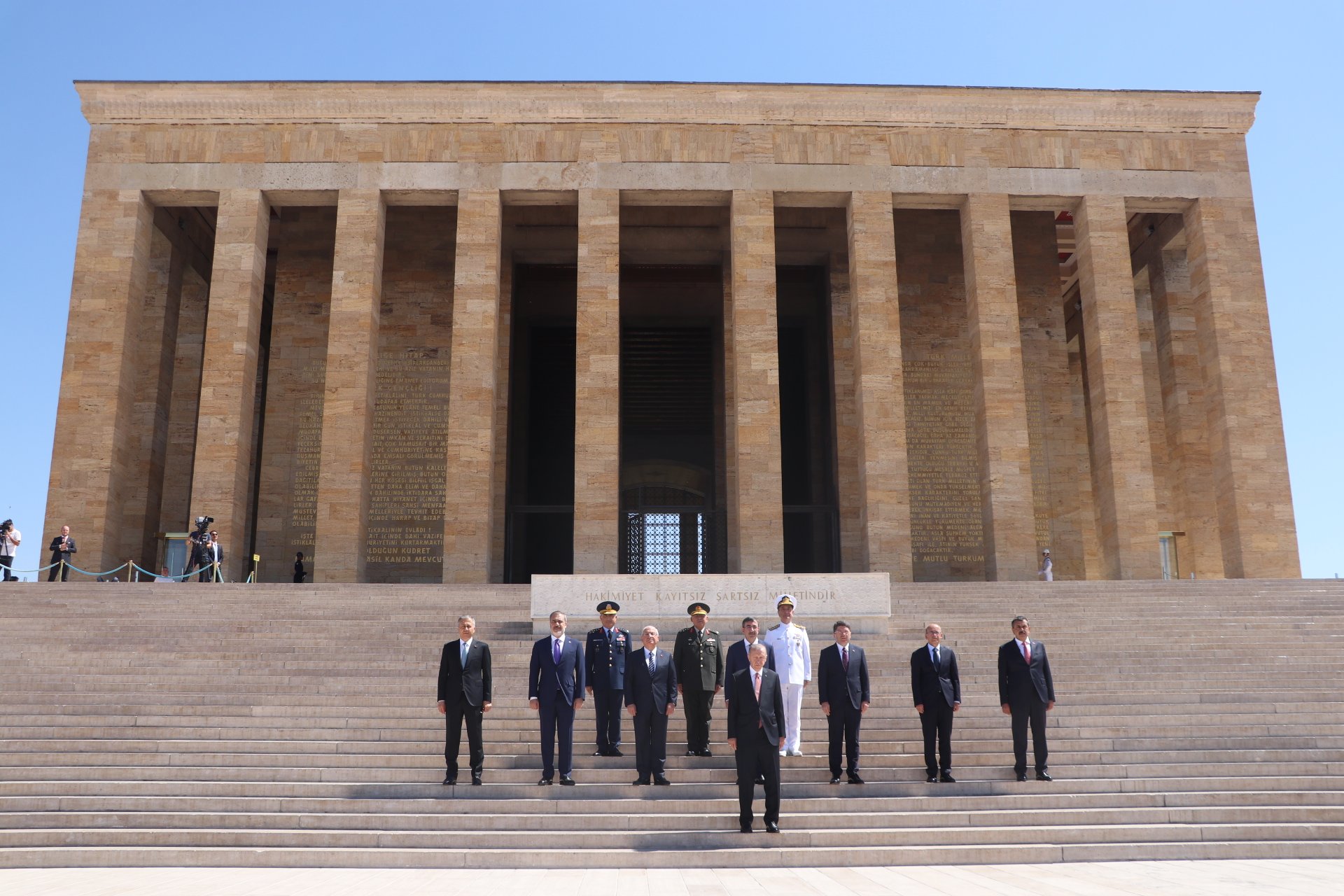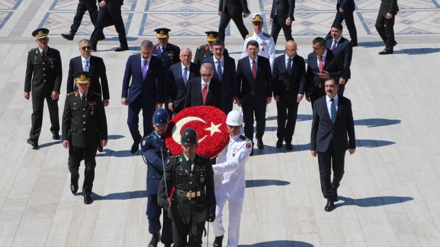 Cumhurbaşkanı Erdoğan, Türk Silahlı Kuvvetleri'nde bir üst rütbeye terfi edecek veya emekliye sevk edilecek general ve amirallerin belirleneceği YAŞ toplantısı öncesi Anıtkabir'i ziyaret etti. Erdoğan, Aslanlı Yol'da beraberinde Cumhurbaşkanı Yardımcısı Cevdet Yılmaz, Milli Savunma Bakanı Yaşar Güler, İçişleri Bakanı Ali Yerlikaya, Adalet Bakanı Yılmaz Tunç, Hazine ve Maliye Bakanı Mehmet Şimşek, Milli Eğitim Bakanı Yusuf Tekin ile Genelkurmay Başkanvekili ve Kara Kuvvetleri Komutanı Orgeneral Musa Avsever, Hava Kuvvetleri Komutanı Orgeneral Atilla Gülan ve Deniz Kuvvetleri Komutanı Oramiral Ercüment Tatlıoğlu ile yürüdü. Mustafa Kemal Atatürk'ün mozolesine çelenk bırakan Erdoğan, saygı duruşunda bulunulması ve İstiklal Marşı'nın okunmasının ardından beraberindeki heyetle Misak-ı Milli Kulesi'ne geçerek, Anıtkabir Özel Defteri'ni imzaladı. Cumhurbaşkanı Erdoğan, şunları yazdı: