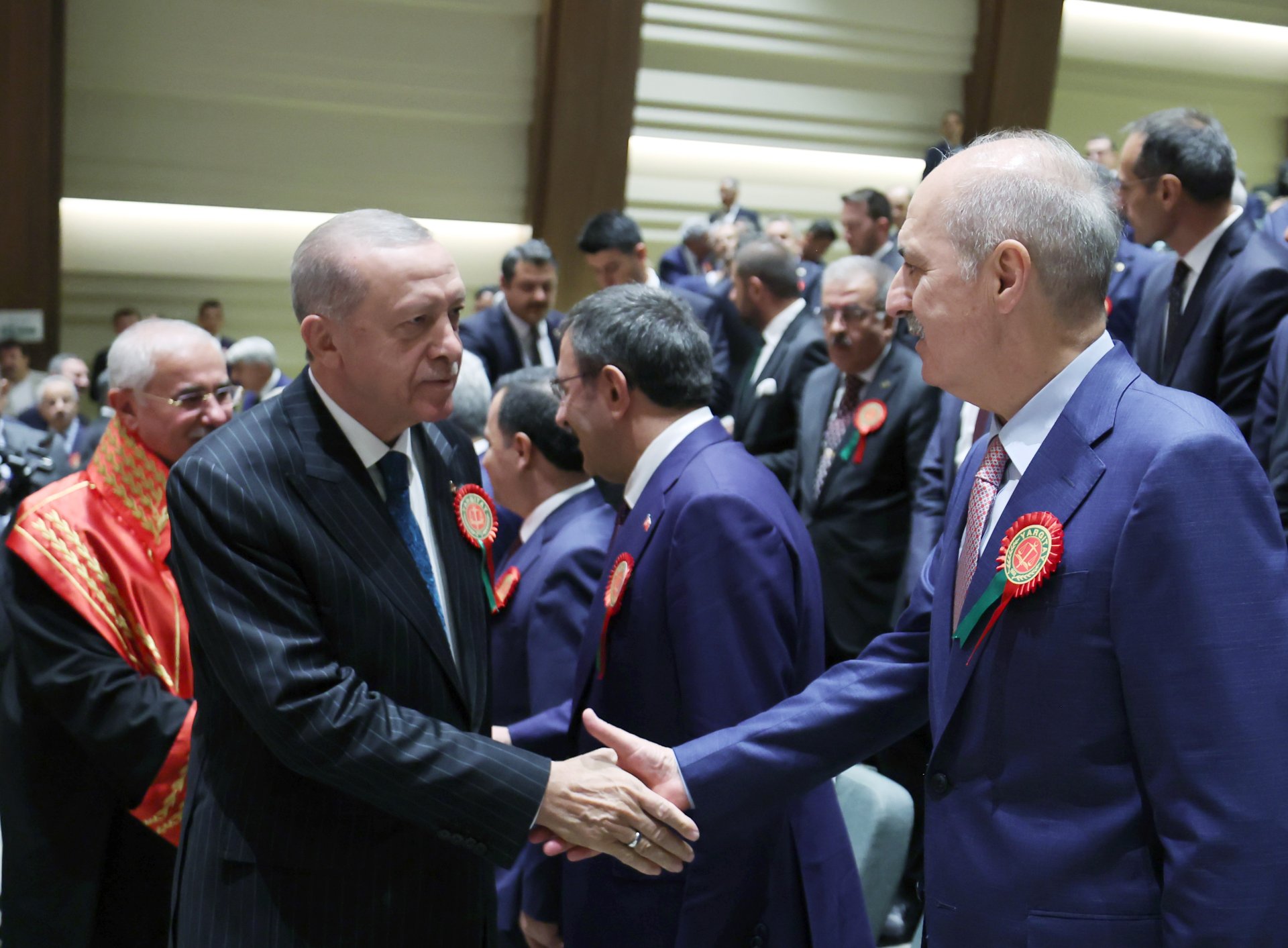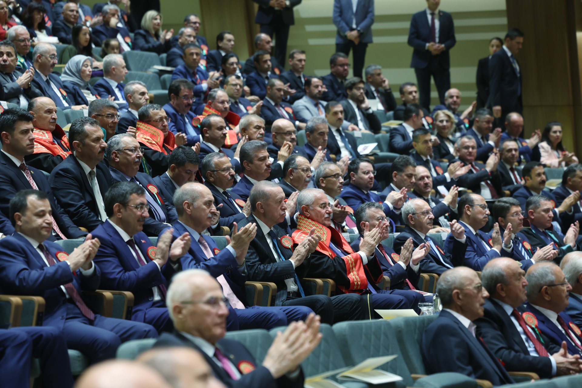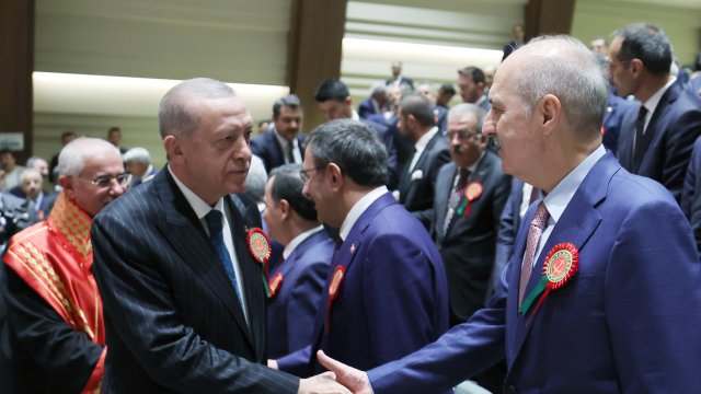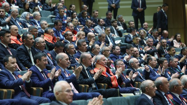 Erdoğan ayrıca, siyasi hayatlarının her döneminde dile getirdikleri, hükümet teklifi olarak da 2011'den beri her seçimde milletin önüne koydukları bir hayalleri olduğunu kaydederek, "Bu hayal, Türkiye'yi Darbe Anayasası ayıbından kurtararak yeni, sivil, dili ve içeriğiyle bugünü ve yarını kucaklayan, Türkiye Yüzyılı'na yakışır bir anayasaya kavuşturmaktır. Darbe Anayasası'nın gölgesinde Türkiye Yüzyılı'nı konuşmayı, ülkemiz ve demokrasimiz için zül addediyoruz. İstiklal ve istikbali için bu kadar ağır bedeller ödemiş milletimizin yeni bir anayasayı, anasının ak sütü gibi hak ettiğine inanıyoruz. Milletimize vaadimiz olan birinci sınıf demokrasi, birinci sınıf ekonomi ve birinci sınıf özgürlüklerin tamamlayıcısı; birinci sınıf anayasa olacaktır. Türkiye Yüzyılı vizyonumuz, böyle bir anayasayla daha güçlenecektir. Bunun için 85 milyonun tamamının sahipleneceği ve 'işte benim Anayasam' diyerek baş tacı edeceği bir metni artık milletin takdirine sunmamız gerekiyor. Buradan, siyasi partilerimizi, yüksek mahkemelerimizi, üniversitelerimizi, devlet kurumlarımızı, barolarımızı, meslek kuruluşlarımızı, sivil toplum örgütlerimizi ve milletimizin her bir ferdini bu sürece katkı vermeye davet ediyorum. Meclis'in açılışıyla birlikte Türk demokrasisini yeni bir anayasaya kavuşturmak için girişimlerimizi tekrar başlatacağız. Yargı kurumlarımızın temsilcileri olarak sizlerden de bu sürece hazırlıklı olmanızı, destek vermenizi bekliyorum" ifadelerini kullandı.