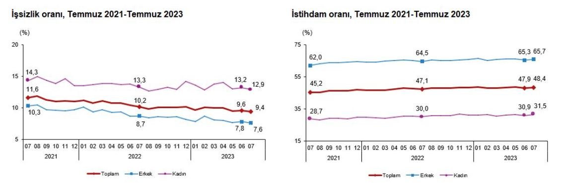 TÜİK, Temmuz 2023 dönemine ilişkin işgücü istatistiklerini açıkladı. Buna göre; 15 ve daha yukarı yaştaki kişilerde işsiz sayısı, temmuz ayında bir önceki aya göre 38 bin kişi azalarak 3 milyon 291 bin kişi oldu. İşsizlik oranı, 0,2 puan azalarak yüzde 9,4 seviyesinde gerçekleşti. İşsizlik oranı erkeklerde yüzde 7,6, kadınlarda yüzde 12,9 kaydedildi. İstihdam edilenlerin sayısı da önceki aya göre 318 bin kişi artarak 31 milyon 671 bin kişi, istihdam oranı 0,5 puan artarak yüzde 48,4 oldu. İstihdam oranı, erkeklerde yüzde 65,7, kadınlarda yüzde 31,5 şeklinde gerçekleşti. İşgücü, bir önceki aya göre 280 bin kişi artarak 34 milyon 962 bin kişi, işgücüne katılma oranı 0,4 puan artarak yüzde 53,4 olarak gerçekleşti. İşgücüne katılma oranı erkeklerde yüzde 71,1, kadınlarda yüzde 36,1.