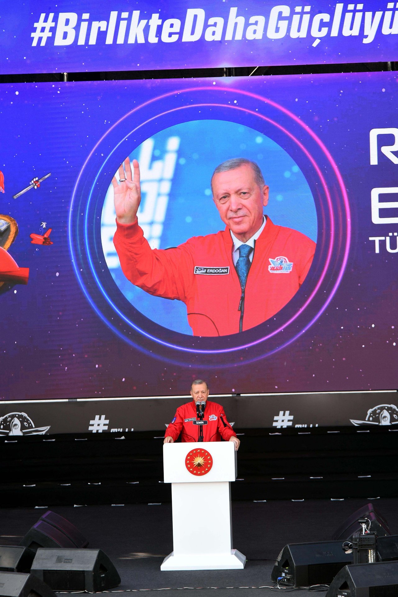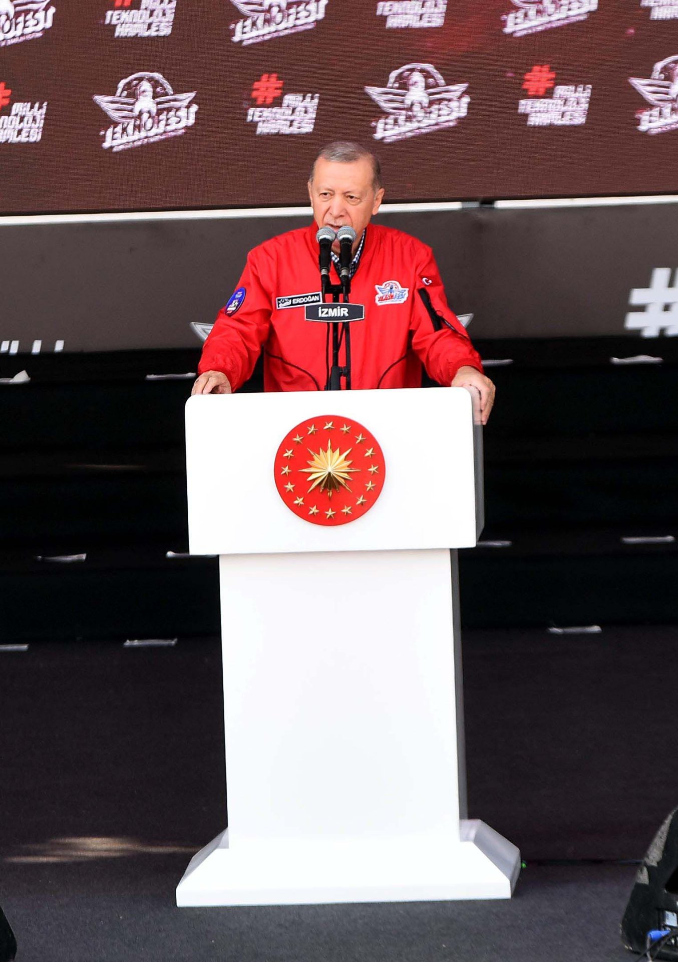 Cumhurbaşkanı Erdoğan, "İzmirli kardeşlerimizi davet ederken; elbette şehrimizin yeni veya eski milletvekillerini de unutmuyoruz. İleri teknolojiyi ülkemiz yerine ta 10 bin kilometre uzaktan arayanları da buraya davet ediyoruz. Bitip tükenmeyen koltuk kavgalarına yalnızca bir günlük 'TEKNOFEST molası' vermeleri kendileri adına büyük kazanç olacaktır. Bugün burada sadece milli teknoloji hamlemizin hepsi gurur kaynağımız olan ürünleri görmüyoruz. Aynı zamanda büyüyen, güçlenen, sınırları aşan, özgüven ve iddia sahibi Türkiye'nin yükselişine de şahit oluyoruz. Çiğli Hava Üssü'nde Kızılelma, Akıncı, ANKA, Hürjet, TB2, TB3, Gökbey, ATAK ile birlikte mücadele var, gayret var, sabır, azim, cesaret var. Burada zorluklar karşısında yıkılmayan, güçlü bir irade var. Burada her türlü engele rağmen başarmaya sevdalı yürekler var. Burada hayallerine giden yolda hiçbir engel tanımayan gençler var. Burada ayağına vurulan asırlık zincirleri parçalayan Türk milleti var. Burada Türkiye Yüzyılı'nın mahsun ve mazlum gönülleri aydınlatan ışığı var. Merhum Abdürrahim Karakoç ne güzel söylemiş, 'İzmir'in sağından, Van'ın solundan, Erzurum, Edirne, Hatay yolundan kapı kapı tekmil Anadolumdan, bir sabah gelecek kardan aydınlık. Evet burada on yıllardır hasretle beklediğimiz kardan aydınlığın muştusu var'" dedi.