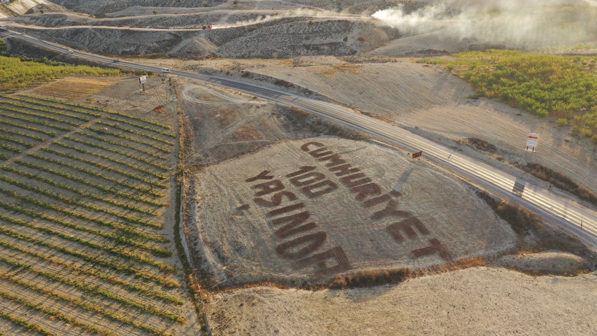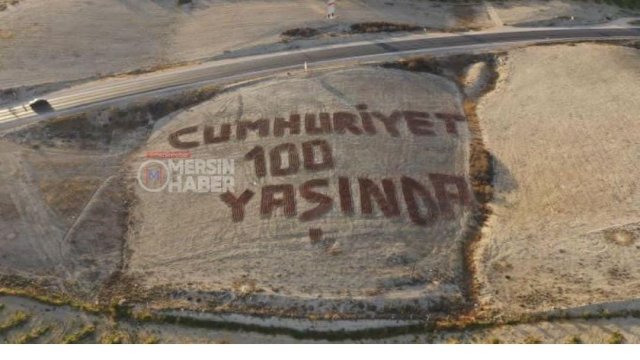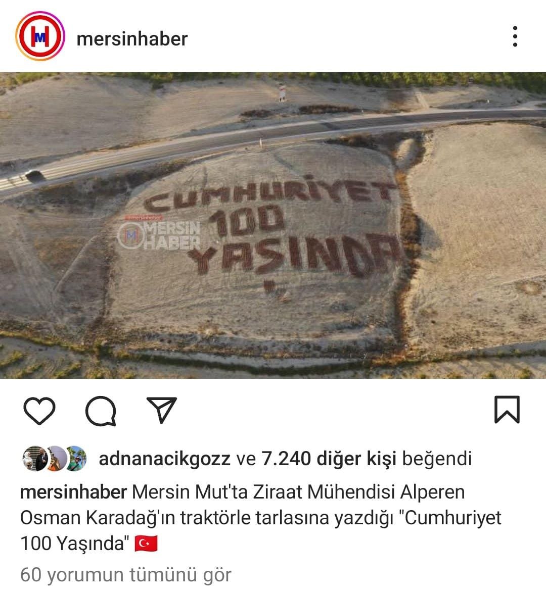 Mut ilçesinde yaşayan ziraat mühendisi Alperen Osman Karadağ, Cumhuriyet'in 100'üncü yılı dolayısıyla farklı bir etkinliğe imza attı. Karadağ, danışmanlığını yaptığı bahçede 5 dekarlık alana 6 saatlik bir çalışmayla traktörle sürerek 'Cumhuriyet 100 yaşında' yazdı. Sosyal medyada paylaşılan görüntüler ilgi gördü.