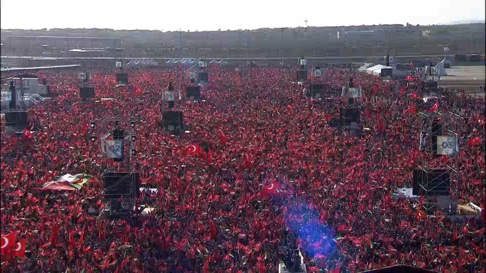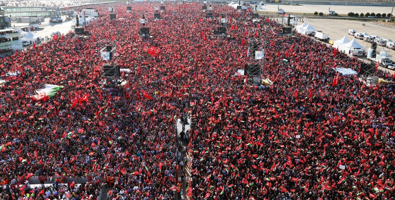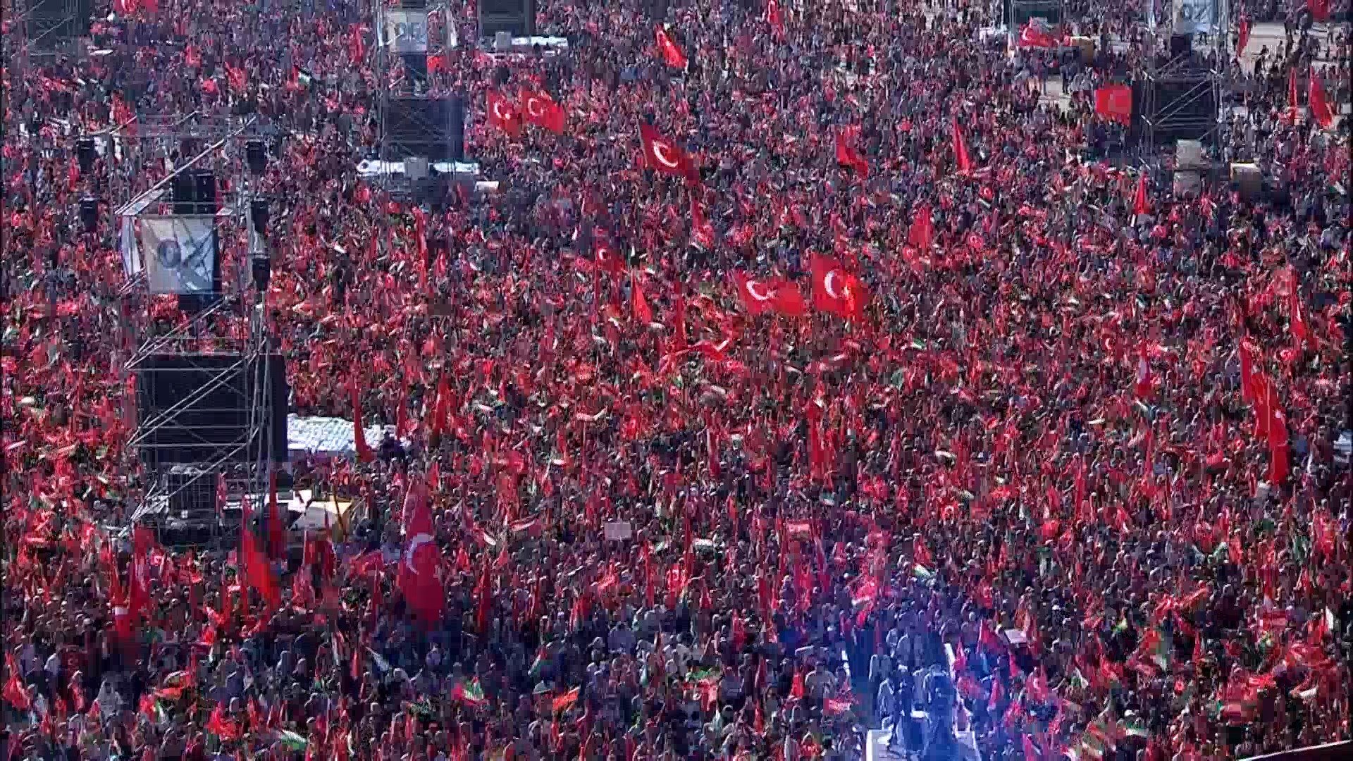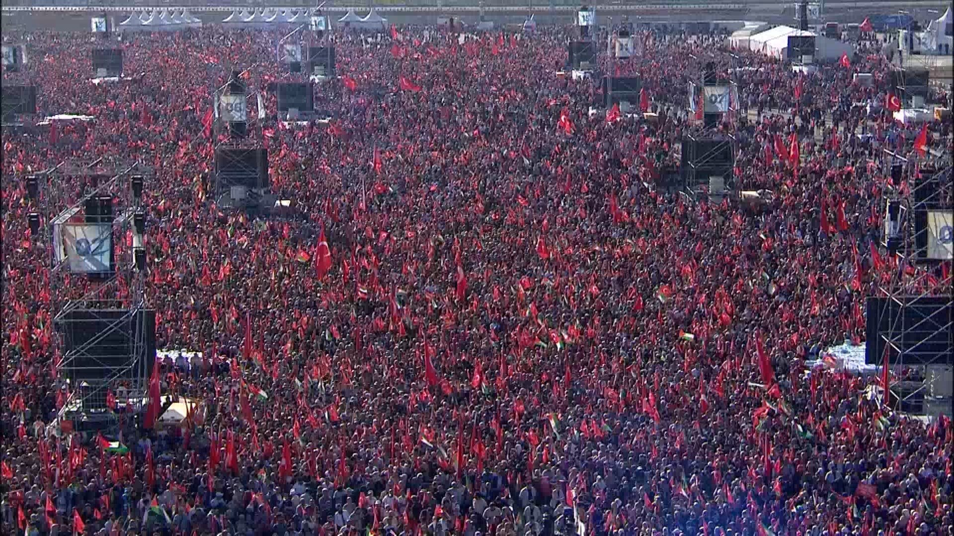 İsrail'in Gazze'de yaptığı saldırılara tepki çekmek, Gazze’ye destek vermek için AK Parti İstanbul İl Başkanlığı tarafından Atatürk Havalimanı'nda Büyük Filistin Mitingi düzenleniyor. Mitinge katılan Cumhurbaşkanı Erdoğan burada yaptığı konuşmada, “Maalesef ülkemin siyasileri içerisinde Hamas’ı Netanyahu’ya bırakan talihsizler var. Netanyahu nasıl teröristte, Hamas da teröristmiş. Yazıklar olsun. Hamas nedir, Hamas kimdir, bundan bir haber olan bedhahlar, talihsizler var. Onlara ülkemde oy atanlar da şu anda iyi düşünmesi lazım. Onlara oy verenler iyi düşünmesi lazım. Bugün burada yaşadığımızı tarih bize yaşatmasın inşallah. Bizim ve bizden önceki kuşağın geçtiği dünyanın dört bir yanındaki kardeşlerimizin yaşadığı acıları takip etmekle, anlatmakla geçti. Kırım’dan Karabağ’a, Bosna’dan Kerkük’e, Filistin’den Türkistan’a, Afganistan’dan Çeçenistan’a pek çok coğrafya için biz gözyaşı döktük. Ömrümüz boşuna geçmedi. Bugün birileri Gazze’yi uzakta, çok uzakta, bizimle hiç alakası olmayan bir yer gibi görüyor hatta bunu ne yazık ki açıkça söylüyor. Halbuki 1 asır önce bu millet için, bu ülke için Adana neyse, Gazze de oydu. Tıpkı Edirne neyse, Üsküp’ün, Kırklareli neyse Selanik’in, Mardin neyse Musul’un, Gaziantep neyse Halep’in o olduğu gibi Gazze de vatan topraklarının ayrılmaz sandığımız bir parçasıydı. Nereden nereye geldik. Çanakkale Şehitliği’ne yolunuz düştüğünde ihmal etmeyin, muhakkak gidin. Mezar taşlarının üzerindeki isimlere ve şehirlere iyi bakın" ifadelerini kullandı.