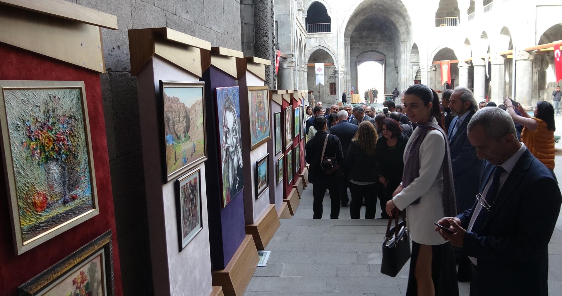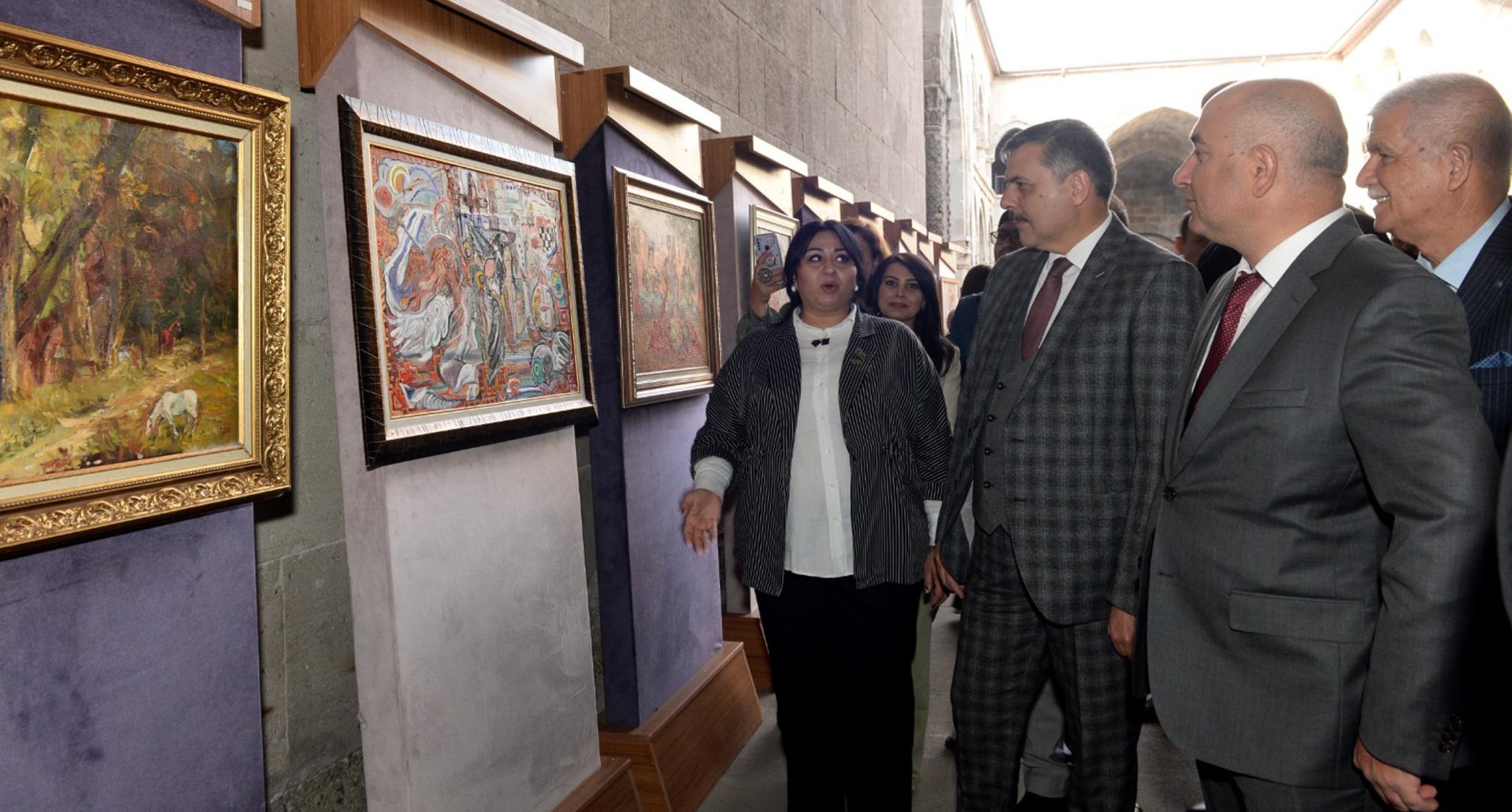 Vali Çiftçi ve davetliler sergiyi gezerek eserler hakkında ressamlardan bilgi aldı.