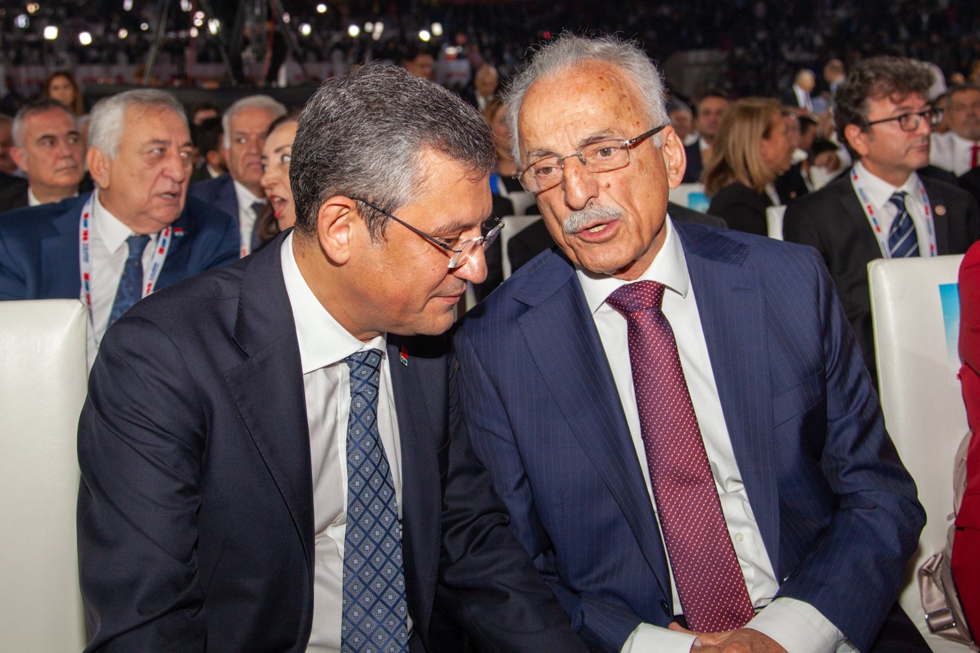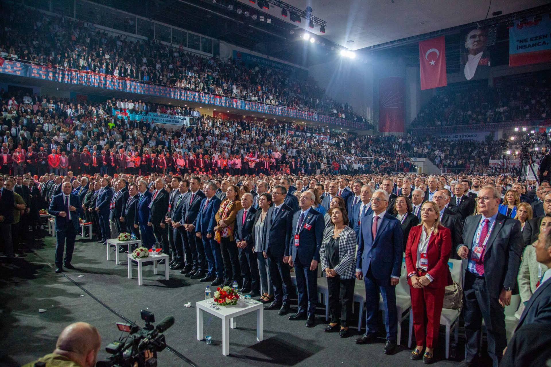 CHP 38'inci Olağan Kurultayı, Ankara Arena Spor Salonu'nda başladı. Kurultay salonuna ilk giriş yapanlar Ankara Büyükşehir Belediye Başkanı Mansur Yavaş, Antalya Büyükşehir Belediye Başkanı Muhittin Böcek ve diğer büyükşehir belediye başkanları oldu. Eski CHP Genel Başkanları Murat Karayalçın, Hikmet Çetin, Altan Öymen, yabancı misyon temsilcileri, siyasi partilerin temsilcileri de kurultaya katıldı. Sahnenin sağında değişimcilerin genel başkan adayı Özgür Özel'i destekleyenler, solunda ise Kemal Kılıçdaroğlu'nu destekleyen partililer yer aldı. Salonda 'Gençliğin umudu Kemal Kılıçdaroğlu', 'Hak, hukuk, adalet', 'Değişim' sloganları atıldı Salona ilk gelen aday Özgür Özel oldu ve kendini destekleyenleri selamladı. Ardından ise Kemal Kılıçdaroğlu, eşi Selvi Kılıçdaroğlu ile birlikte salona girdi. Özel ve Kılıçdaroğlu, tokalaşarak yerlerine geçti. Önce Kılıçdaroğlu'nun yer aldığı video salonda kurulan dev ekranda izletildi.