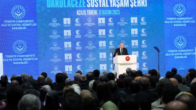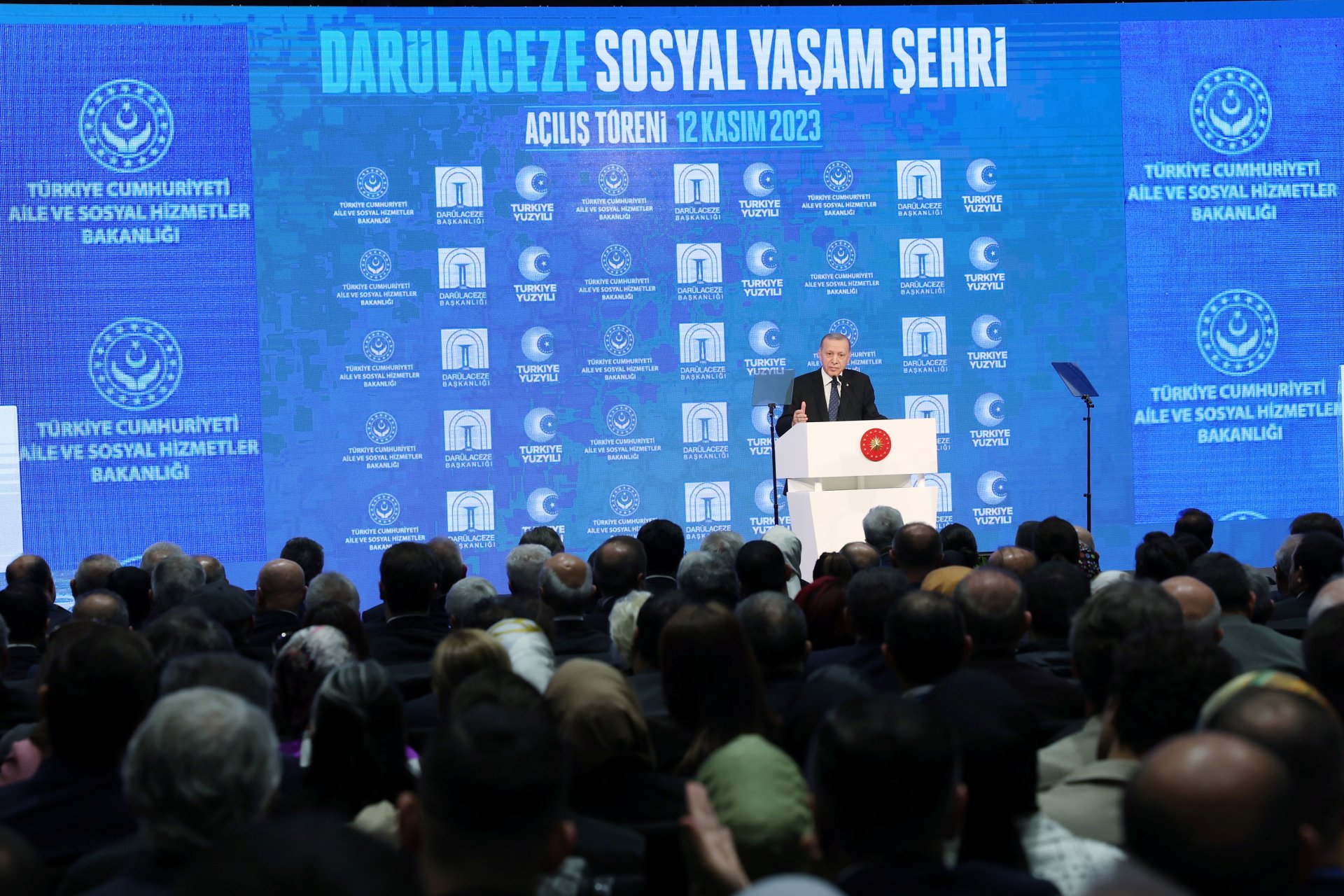 Cumhurbaşkanı Erdoğan, "Laf yerine hizmet ve icraat üreten anlayışımızın en güzel örneği, bugün açılışını yazdığımı güzide eserdir. Darülaceze Sosyal Yaşam Şehri'nin temelini bundan yaklaşık 1 buçuk yıl önce, 20 Mayıs 2022 tarihinde atmıştık. Hedefimiz burayı 1 sene içerisinde bitirip insanımızın hizmetine sunmaktı. Ancak, 6 Şubat'ta yaşadığımız ve 50 binden fazla canımızı yıkıntıların altında kaybettiğimiz depremler sebebiyle 5 aylık bir gecikme oldu. Deprem felaketine rağmen projemizin inşa sürecini yakından takip ettik. Aile Bakanımıza gerekli talimatları vererek bir an önce tamamlanması için tüm imkanlarımızı seferber ettik. Hamd olsun bugün de açılışını gerçekleştirmenin gururunu yaşıyoruz. İnşaat alanı 145 bin 727 metrekareyi bulan Sosyal Yaşam Şehrimiz yatay mimari prensibine göre imar edildi. Şehrimiz sağlıklı, yatağa bağımlı, Alzheimer, demans ve çocuk birimlerini barındıran 928 yatak kapasitesine sahip 23 bloktan oluşuyor. Bu bloklara ek olarak şehrimizde cami, kilise ve havra bulunuyor. Ayrıca 5 bloktan müteşekkil bağışçı birimi 19 bin metrekare üzerinde konumlandırılarak 400 yatak kapasiteli bir rezerv alan bırakıyor. Peyzaj alanında yürüyüş yolları, farklı oturma grupları, bisiklet yolları, göletler, hobi bahçeleri düzenleniyor. Barınma birimleri, her katta ortak dinlenme alanı, kat mutfağı olan en fazla 4 kişilik odalardan müteşekkildir. İdari binaları, polikliniği, konferans merkezi, rehabilitasyon ve fizik tedavi merkezleriyle diğer tüm sosyal donatılarıyla her açıdan örnek bir eseri İstanbulumuza ve ülkemize kazandırdığımızı görüyoruz. Darülaceze Sosyal Yaşam Şehrimizin kamu hizmeti mimarisi alanında dünyanın en saygın gayrimenkul ödüllerinden biriyle taltif edilmesini bunun bir ispatı olarak değerlendiriyoruz. Çok önemli bir hususu ifade etmeden geçemeyeceğim. Darülaceze'nin kuruluşuna katkı sağlamak amacıyla düzenlenen müzayedeye cennet mekan Sultan Abdülhamid Han kendi şahsi servetinden bağışladığı özel eşyalarıyla öncülük etmişti. Böylece Abdülhamid Han büyük hayır hareketine binlerce hayırseverin katılmasını sağlamıştı. Darülaceze o günden beri tüm hizmetlerini hayırseverlerin ve gönüllülerin bağışlarıyla yürütüyor. Biz de temel atma törenimizde hayırseverlerimizin proje sahip çıkmasını beklediğimizi dile getirmiştik. Birçok kuruluşumuz ve şirketimiz bu çağrımız müspet cevap vererek, çorbada bizim de tuzumuz olsun dedi. Bu minvalde ikincisi 2021 yılında gerçekleşen iyilik müzayedesiyle bu projeye katkıda bulunan tüm bağışçılarımıza özellikle teşekkür ediyorum." diye konuştu.