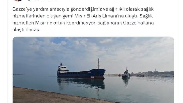 Bakan Koca, sosyal medya hesabından Gazze'ye sağlık malzemesi taşıyan geminin görüntülerini paylaşarak, "Gazze'ye yardım amacıyla gönderdiğimiz ve ağırlıklı olarak sağlık hizmetlerinden oluşan gemi, Mısır El-Ariş Limanı'na ulaştı. Sağlık hizmetleri Mısır ile ortak koordinasyon sağlanarak Gazze halkına ulaştırılacak" dedi.