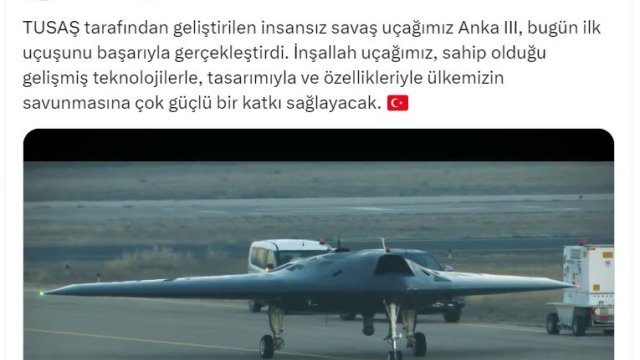 TUSAŞ Genel Müdürü Temel Kotil de "Anka III gökyüzüyle buluştu. 1 saat 10 dakika havada kalan Anka III, test boyunca 8 bin ft. irtifaya çıkarak ilk uçuş testini başarıyla gerçekleştirdi. Bu süreçte yolumuzu açan Sayın Cumhurbaşkanımıza şükranlarımızı sunar, emeği geçen tüm çalışma arkadaşlarıma teşekkür ederim" dedi.