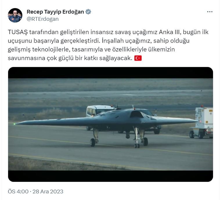 Cumhurbaşkanı Recep Tayyip Erdoğan, sosyal medya hesabından yaptığı duyuruda, "TUSAŞ tarafından geliştirilen insansız savaş uçağımız Anka III, bugün ilk uçuşunu başarıyla gerçekleştirdi. İnşallah uçağımız, sahip olduğu gelişmiş teknolojilerle, tasarımıyla ve özellikleriyle ülkemizin savunmasına çok güçlü bir katkı sağlayacak" ifadelerini kullandı.