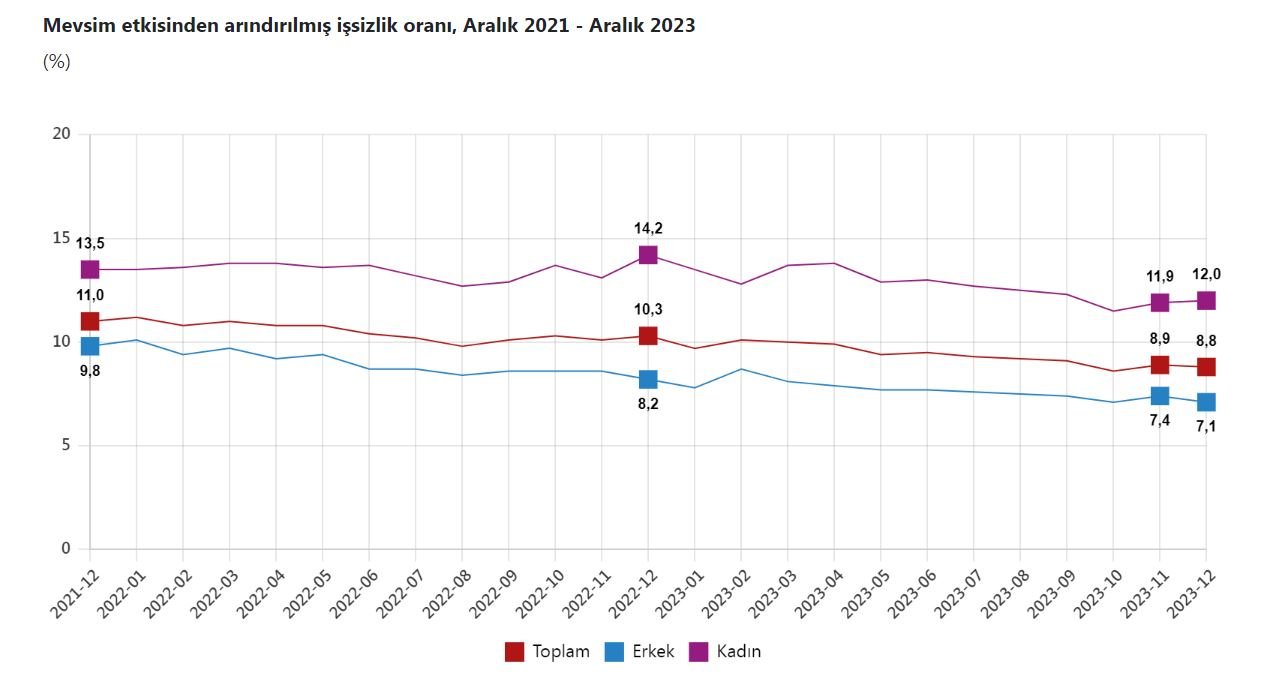 TÜİK, Aralık 2023 dönemine ilişkin iş gücü istatistiklerini açıkladı. Hanehalkı İşgücü Araştırması sonuçlarına göre; 15 ve daha yukarı yaştaki kişilerde işsiz sayısı 2023 yılı aralık ayında bir önceki aya göre 12 bin kişi azalarak 3 milyon 98 bin kişi oldu. İşsizlik oranı ise 0,1 puan azalarak yüzde 8,8 seviyesinde gerçekleşti. İşsizlik oranı erkeklerde yüzde 7,1 iken kadınlarda yüzde 12 olarak tahmin edildi. İstihdam edilenlerin sayısı aralık ayında bir önceki aya göre 399 bin kişi artarak 32 milyon 56 bin kişi, istihdam oranı ise 0,6 puan artarak yüzde 48,8 oldu. Bu oran erkeklerde yüzde 66,1 iken kadınlarda yüzde 31,9 olarak gerçekleşti. İş gücü aralık ayında bir önceki aya göre 387 bin kişi artarak 35 milyon 154 bin kişi, iş gücüne katılma oranı ise 0,5 puan artarak yüzde 53,5 olarak gerçekleşti. İşgücüne katılma oranı erkeklerde yüzde 71,1 iken kadınlarda yüzde 36,3 oldu.