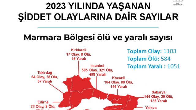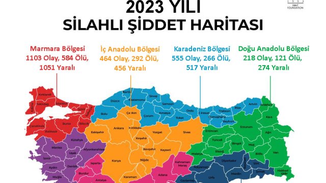 2023 yılında yaşanan silahlı şiddete bölgeler bazında bakıldığında; nüfus yoğunluğunun yaşandığı Marmara Bölgesi’ndeki 11 ilde yaşanan ve basına yansıyan toplam bin 103 olayda, 584 kişi öldürüldü, bin 51 kişi de yaralandı. İstanbul 505 olayla en çok olayın yaşandığı kent oldu. Basına yansıyan bu 505 şiddet olayında 321 kişi öldü, 498 kişi de yaralandı. İstanbul’u 80 kişinin öldüğü, 144 kişinin yaralandığı 164 olayla sanayi kenti Kocaeli, 144 olayla Sakarya, 135 olayla Bursa izliyor.