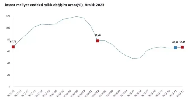 TÜİK, Aralık 2023 dönemine ilişkin inşaat maliyet endeksi verilerini açıkladı. Buna göre; inşaat maliyet endeksi, bir önceki aya göre yüzde 1,94, bir önceki yılın aynı ayına göre yüzde 67,31 arttı. Bir önceki aya göre malzeme endeksi yüzde 2,05 arttı, işçilik endeksi yüzde 1,67 arttı. Ayrıca bir önceki yılın aynı ayına göre malzeme endeksi yüzde 54,26 arttı, işçilik endeksi yüzde 111,83 arttı.