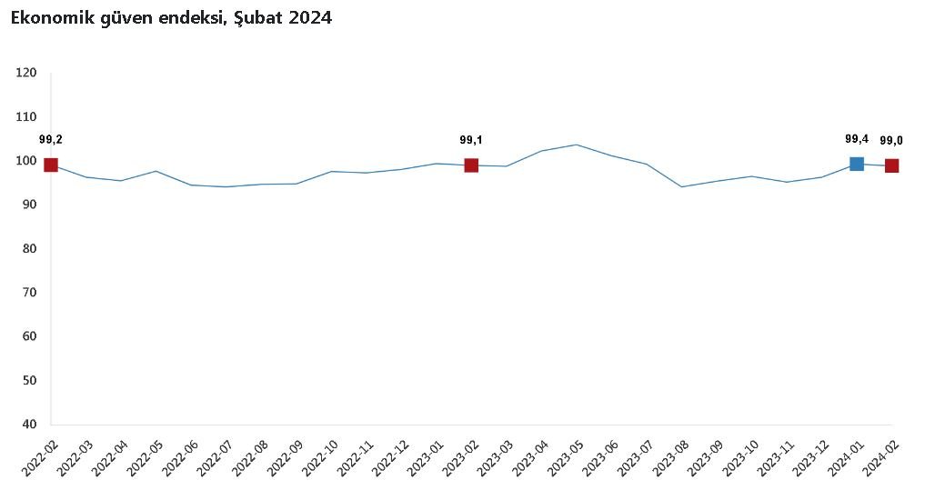 TÜİK, Şubat 2024 dönemine ilişkin ekonomik güven endeksi verilerini açıkladı. Buna göre; ekonomik güven endeksi, şubatta bir önceki aya göre yüzde 0,4 oranında azaldı. Ocak ayında 99,4 olan endeks, şubatta 99 değerini aldı. Şubat ayında tüketici güven endeksi yüzde 1,3 oranında azalarak 79,3, reel kesim (imalat sanayi) güven endeksi yüzde 0,9 oranında azalarak 102, hizmet sektörü güven endeksi yüzde 1,6 oranında artarak 118,6, perakende ticaret sektörü güven endeksi yüzde 1 oranında azalarak 114,5, inşaat sektörü güven endeksi yüzde 1 oranında artarak 91,8 oldu